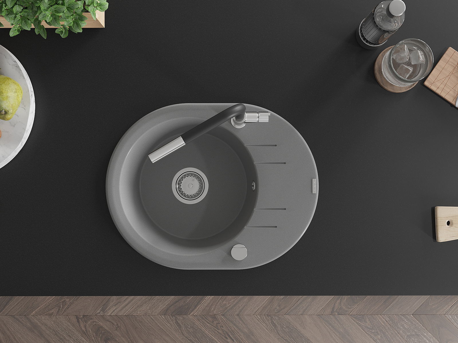 Mexen Kevin zlewozmywak granitowy 1-komorowy z ociekaczem i baterią kuchenną Flora, szary - 6517-71-670401-07