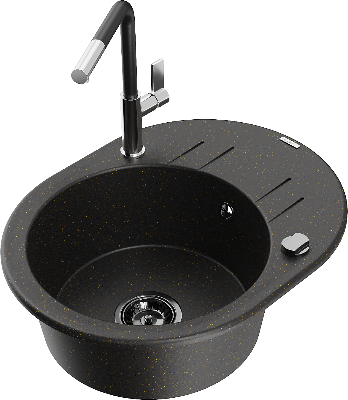 Mexen Kevin zlewozmywak granitowy 1-komorowy z ociekaczem i baterią kuchenną Flora, czarny/złoty metalik - 6517-75-670401-07-B