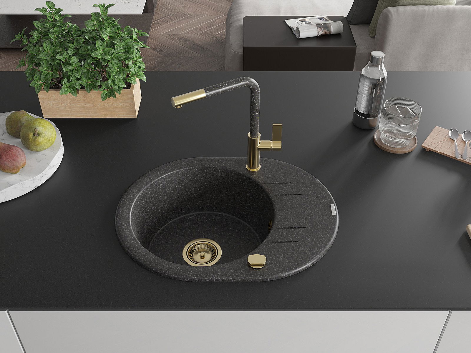 Mexen Kevin zlewozmywak granitowy 1-komorowy z ociekaczem i baterią kuchenną Flora, czarny nakrapiany - 6517-76-670401-75-G