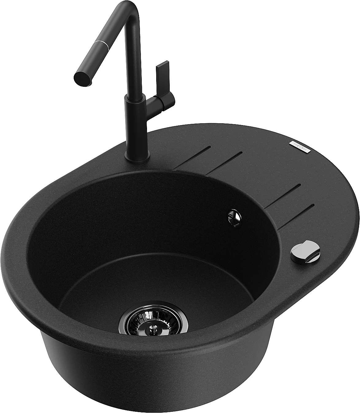 Mexen Kevin zlewozmywak granitowy 1-komorowy z ociekaczem i baterią kuchenną Flora, czarny - 6517-77-670401-70-B