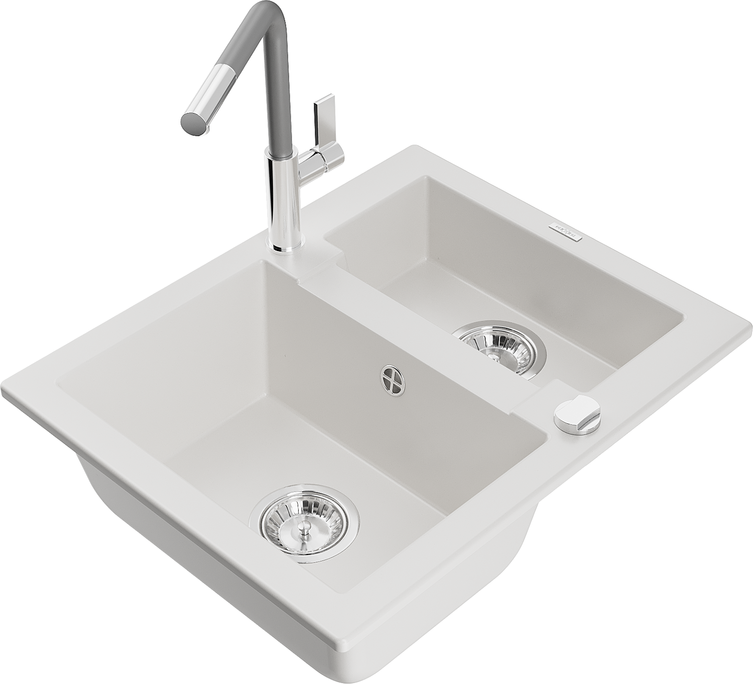 Mexen Carlos zlewozmywak granitowy 1,5-komorowy z baterią kuchenną Flora, biały - 6518-20-670401-06