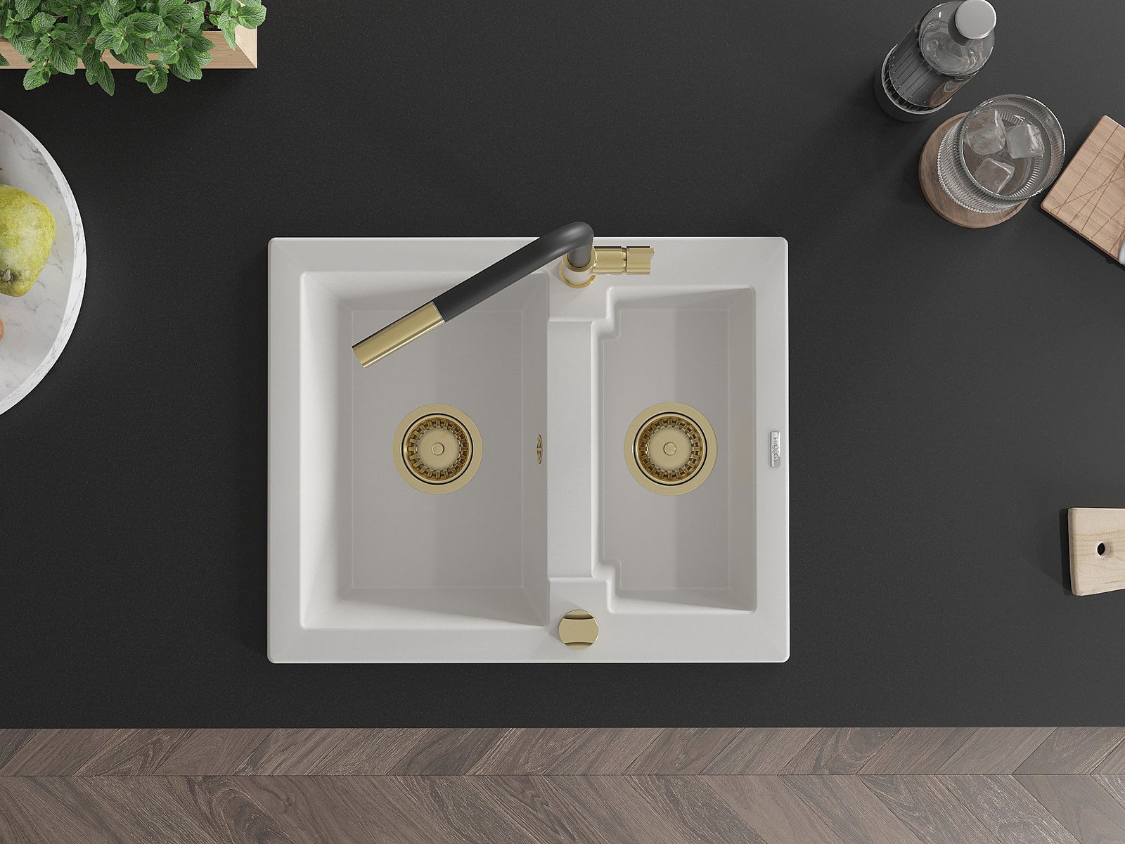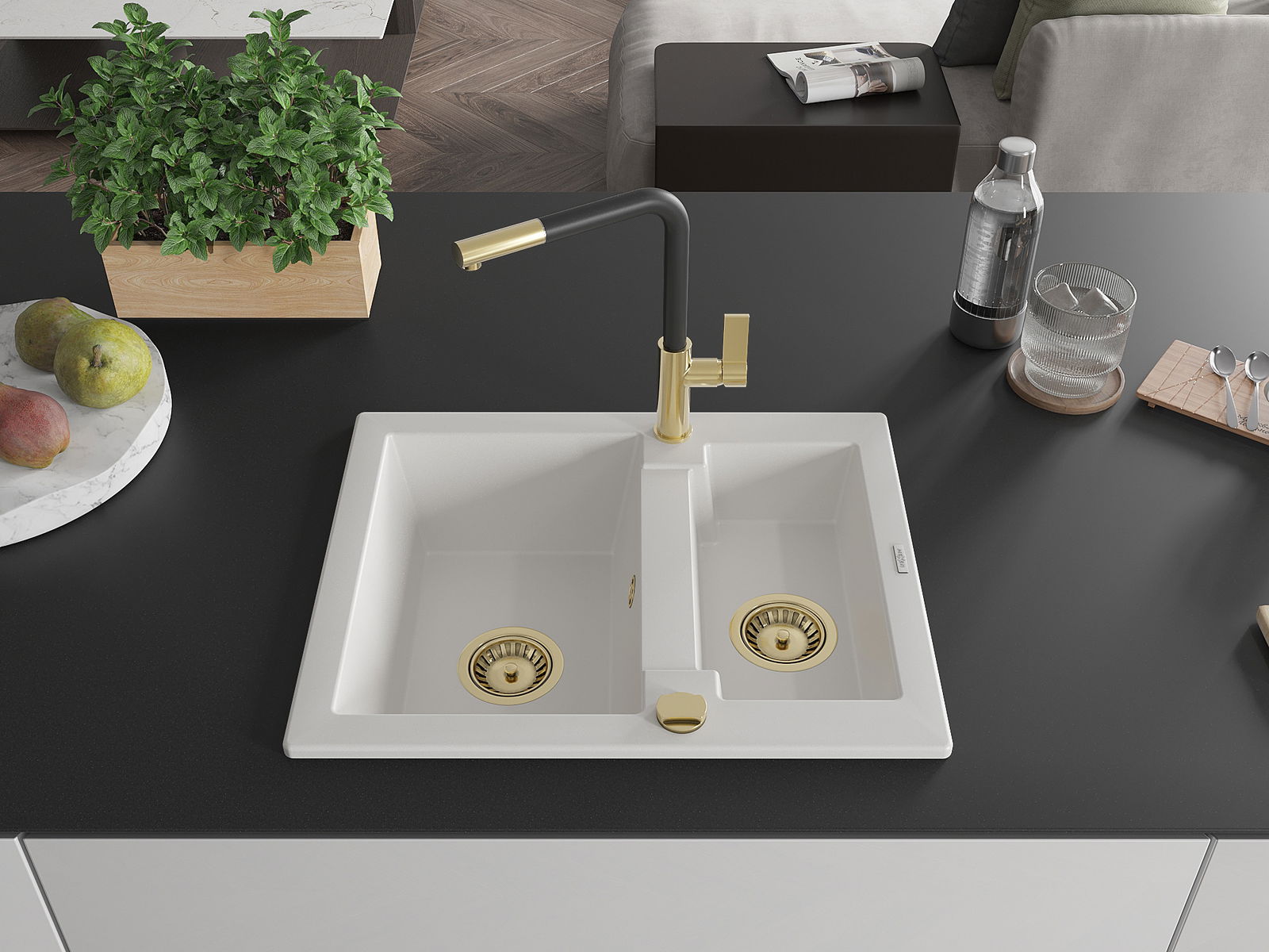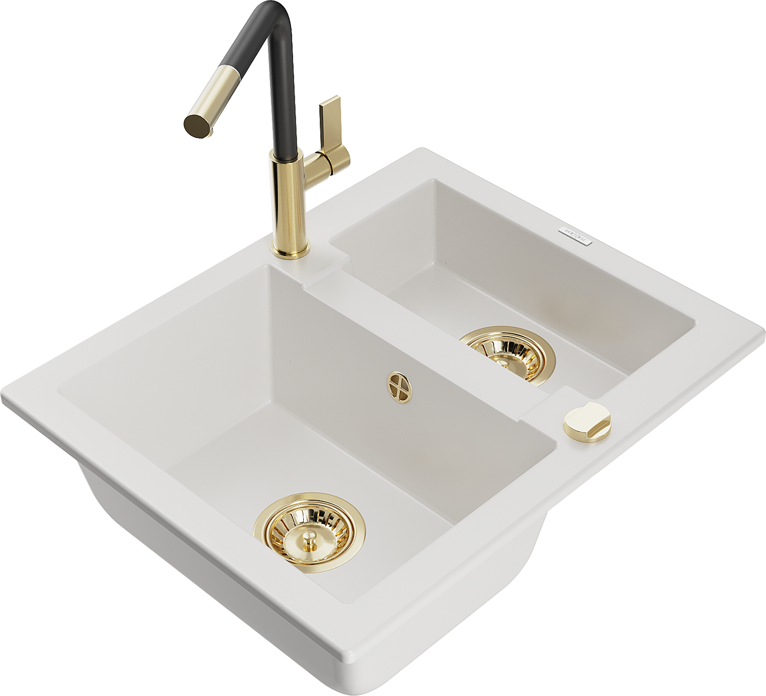Mexen Carlos zlewozmywak granitowy 1,5-komorowy z baterią kuchenną Flora, biały - 6518-20-670401-57-G