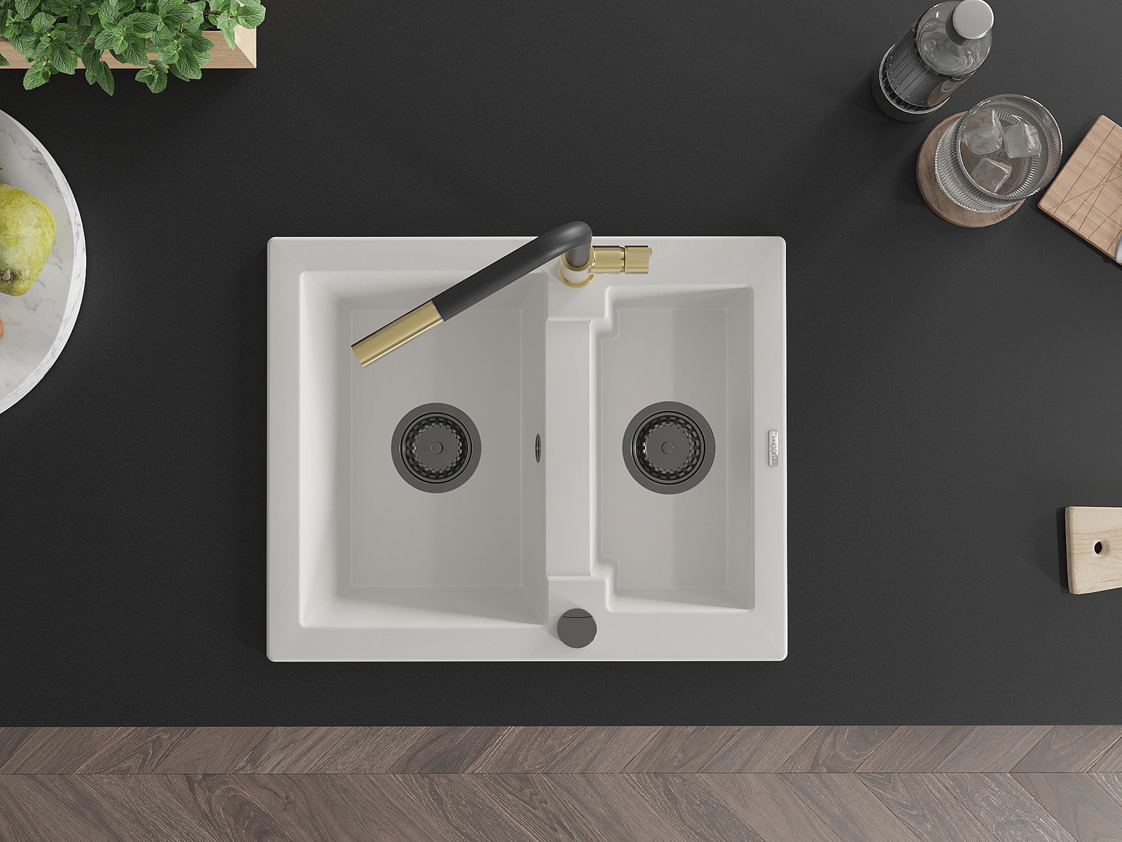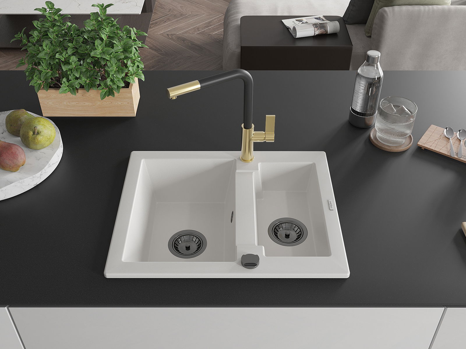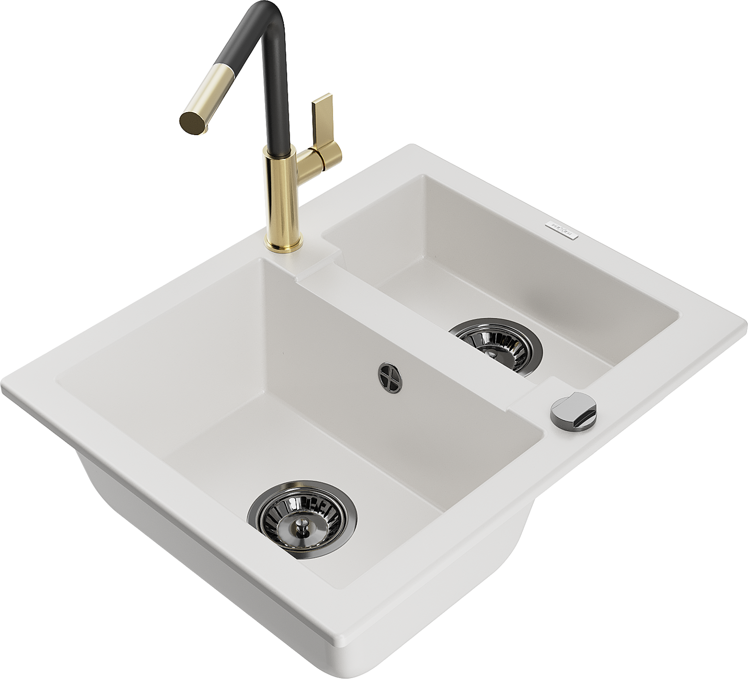 Mexen Carlos zlewozmywak granitowy 1,5-komorowy z baterią kuchenną Flora, biały - 6518-20-670401-57-B