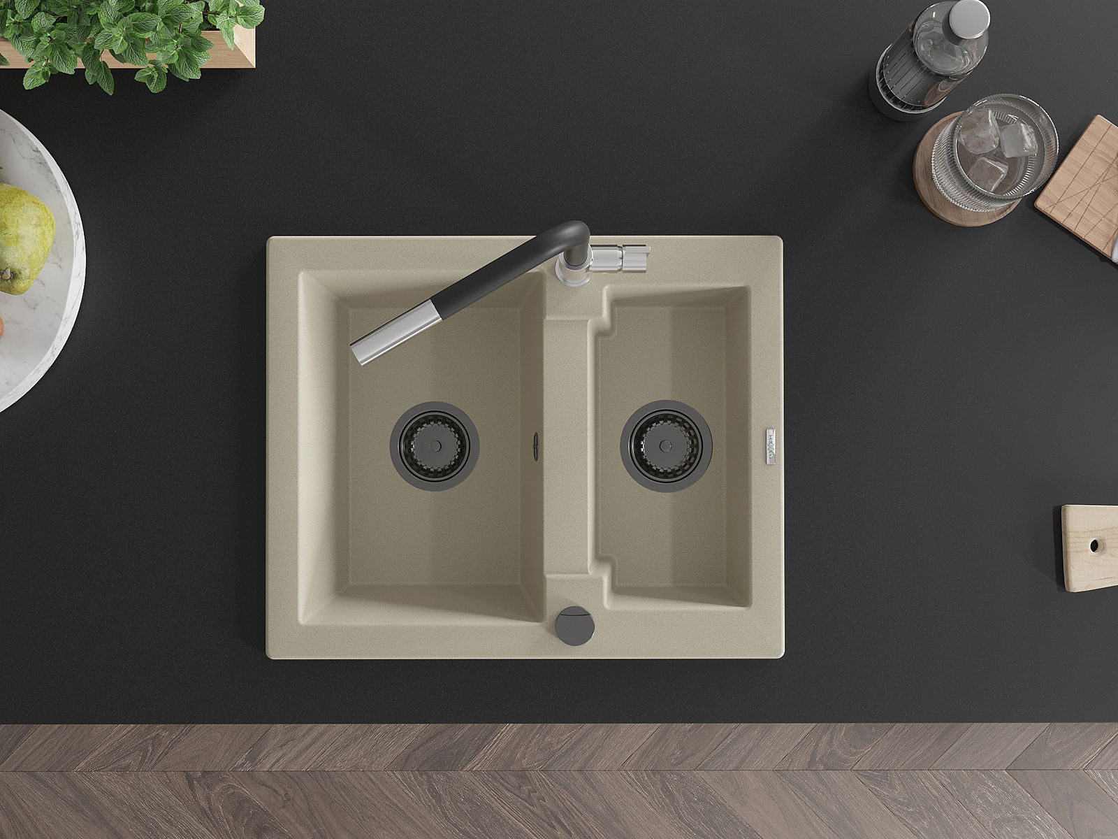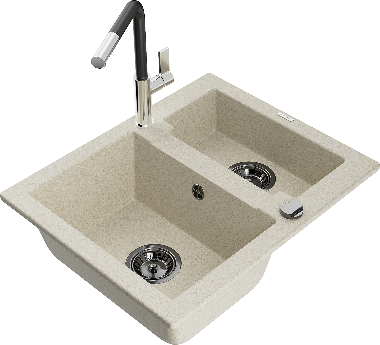 Mexen Carlos zlewozmywak granitowy 1,5-komorowy z baterią kuchenną Flora, beżowy - 6518-69-670401-07-B