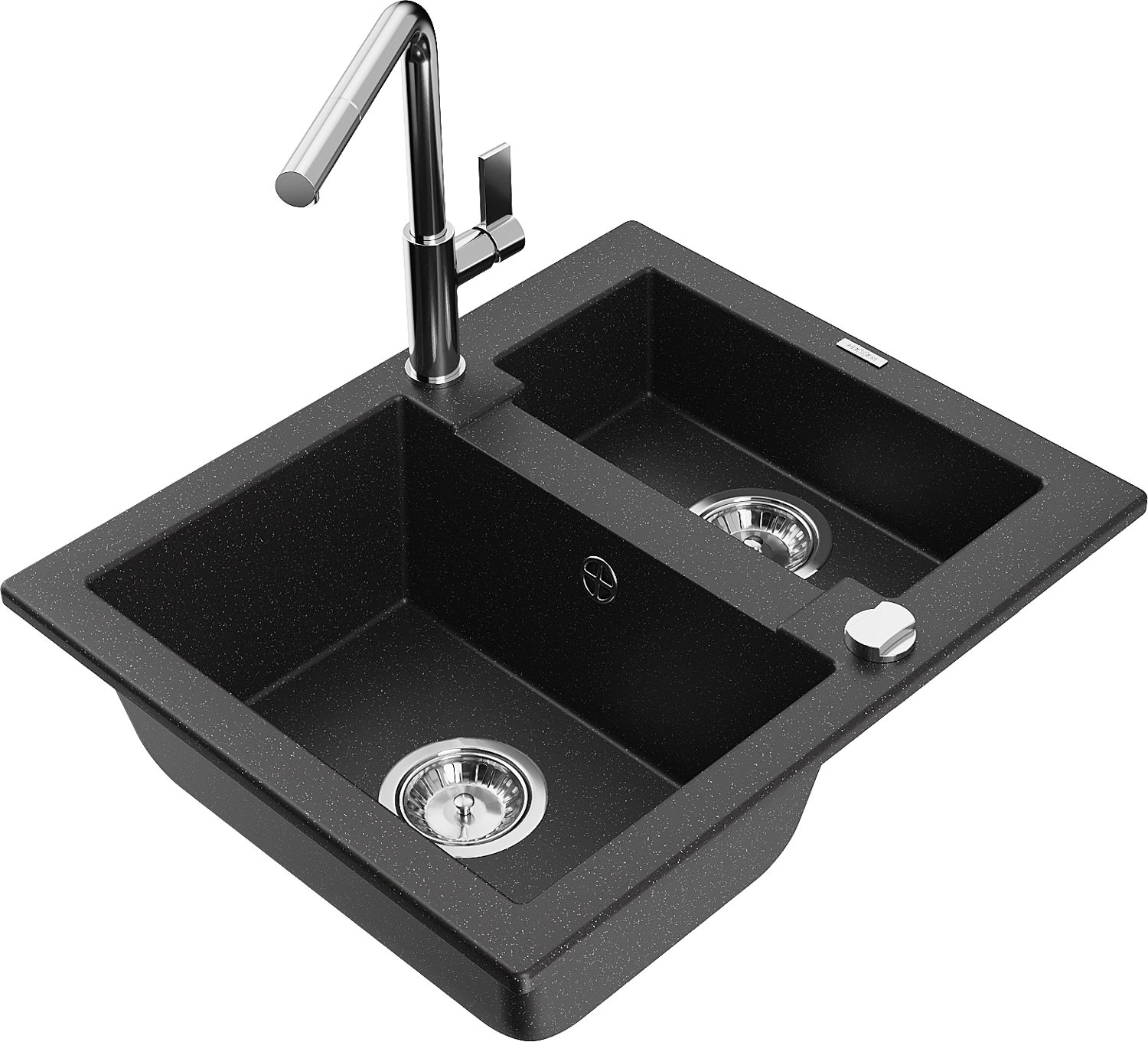 Mexen Carlos zlewozmywak granitowy 1,5-komorowy z baterią kuchenną Flora, czarny/srebrny metalik - 6518-73-670401-00