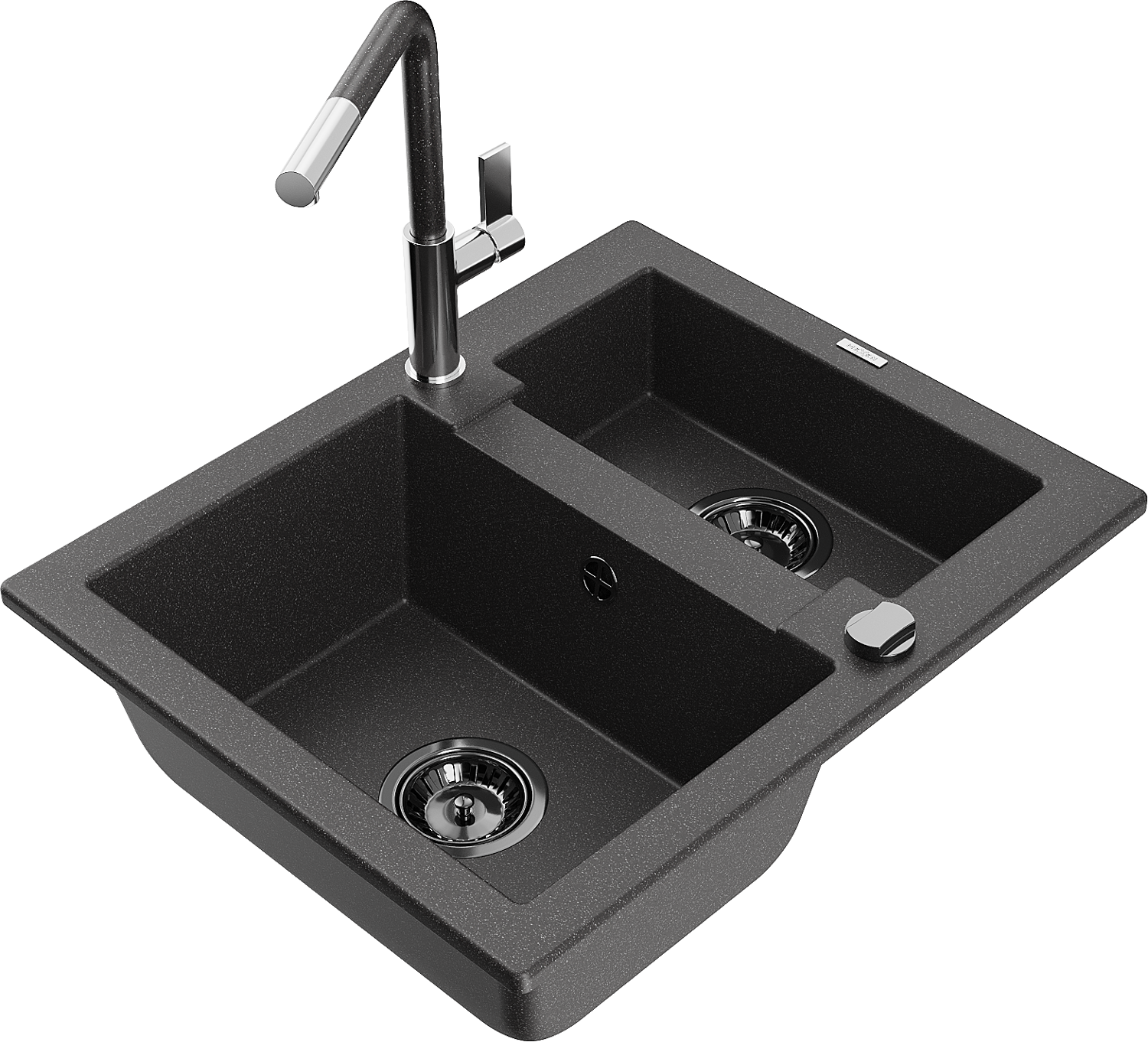 Mexen Carlos zlewozmywak granitowy 1,5-komorowy z baterią kuchenną Flora, czarny nakrapiany - 6518-76-670401-08-B
