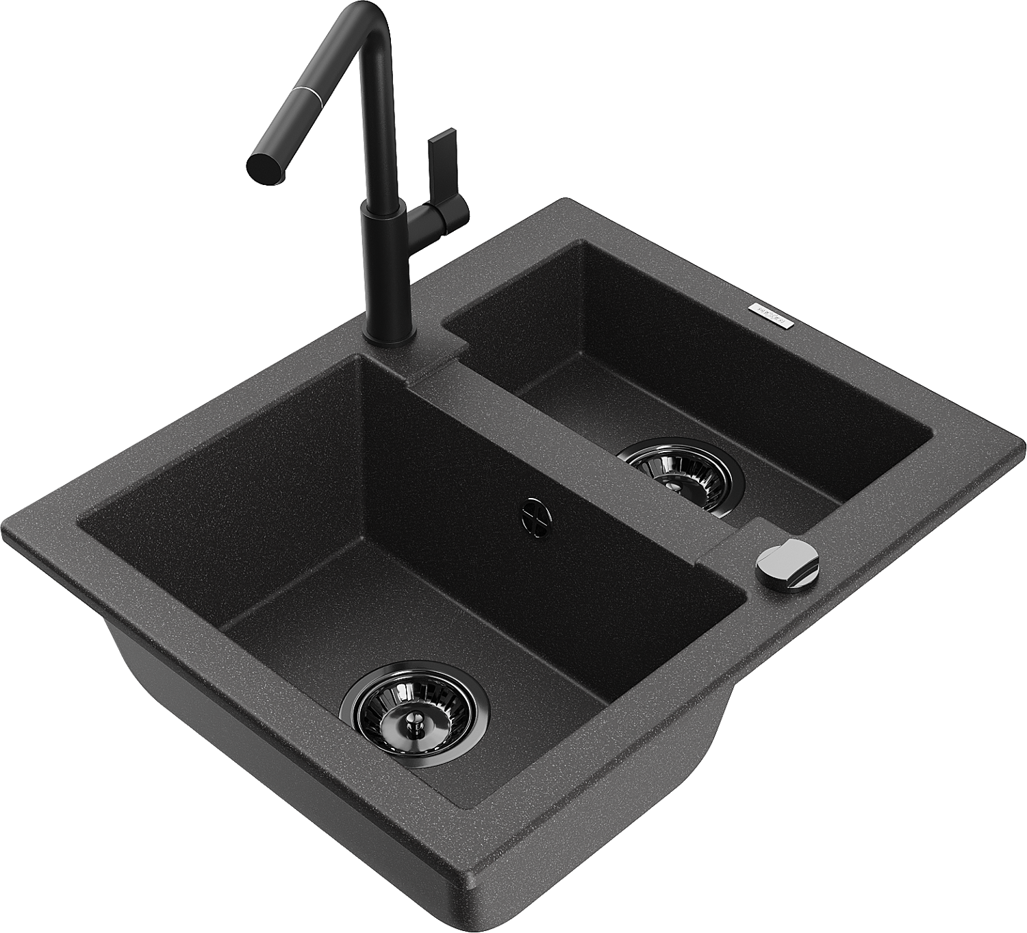 Mexen Carlos zlewozmywak granitowy 1,5-komorowy z baterią kuchenną Flora, czarny nakrapiany - 6518-76-670401-70-B