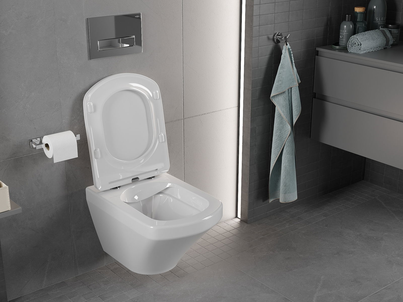 Cienka deska o wyjątkowo ergonomicznym kształcie i niezwykle smukłym wyglądzie. Konstrukcja idealnie dopasowuje się do nowoczesnego wnętrza łazienki, dając wrażenie lekkości. Doskonały wybór do minimalistycznych aranżacji.
