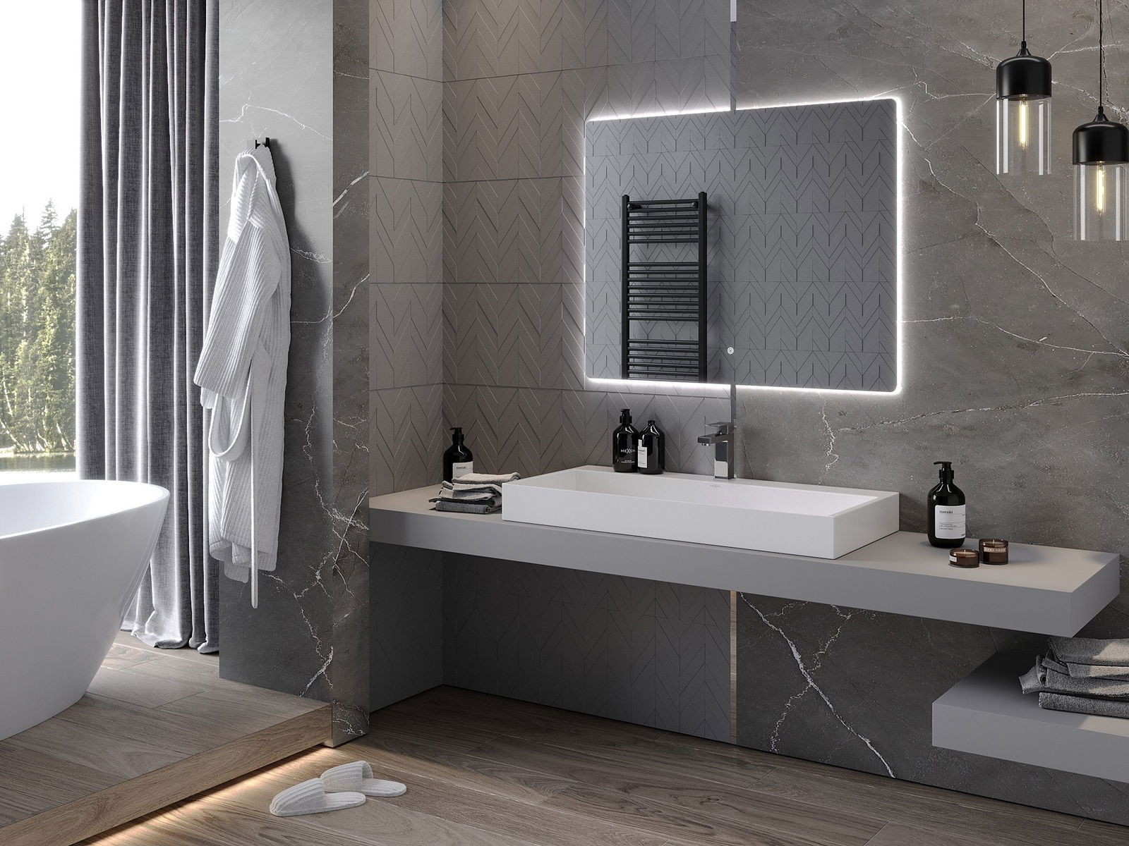 Podświetlenie LED przy lustrze to praktyczny element, który ułatwia codzienną pielęgnację, dzięki możliwości idealnego doświetlenia twarzy. Podświetlenie nadaje łazience nowoczesnego wykończenia, podkreślając jej elegancki wystrój.