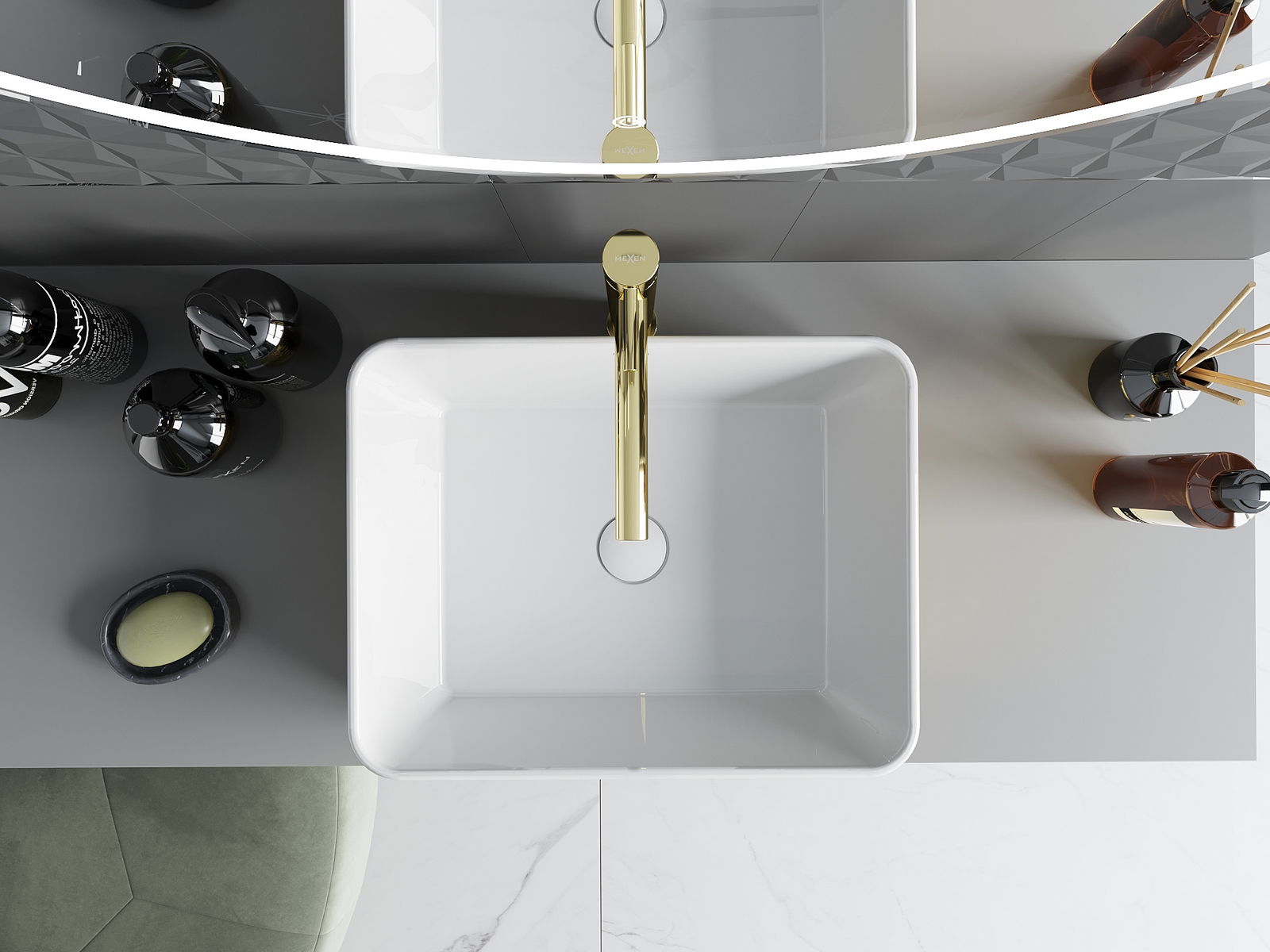 Mexen Catia to elegancka umywalka nablatowa w rozmiarze 48 x 38 cm, wykonana z ceramiki sanitarnej, która łączy w sobie estetykę i funkcjonalność. Jej biało-złoty wzór w formie łuski nadaje łazience unikalny charakter, a prostokątny kształt dodaje nowoczesnego wydźwięku. Dzięki matowej powierzchni oraz ochronnej powłoce, umywalka jest łatwa w utrzymaniu czystości i odporna na zarysowania. Bez otworów na baterie i przelew, ma elegancki wygląd, idealny do minimalistycznych aranżacji wnętrz.