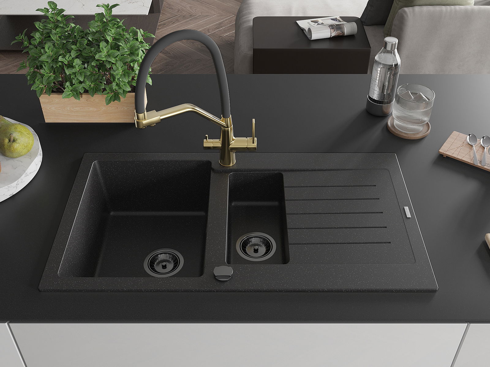 Mexen Matias zlewozmywak granitowy 1,5-komorowy z ociekaczem i baterią kuchenną Duo, czarny/srebrny - 6502-73-671701-57-B