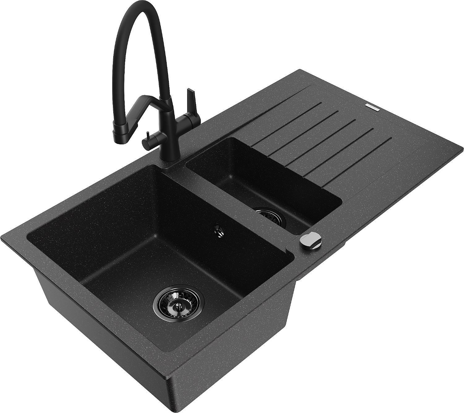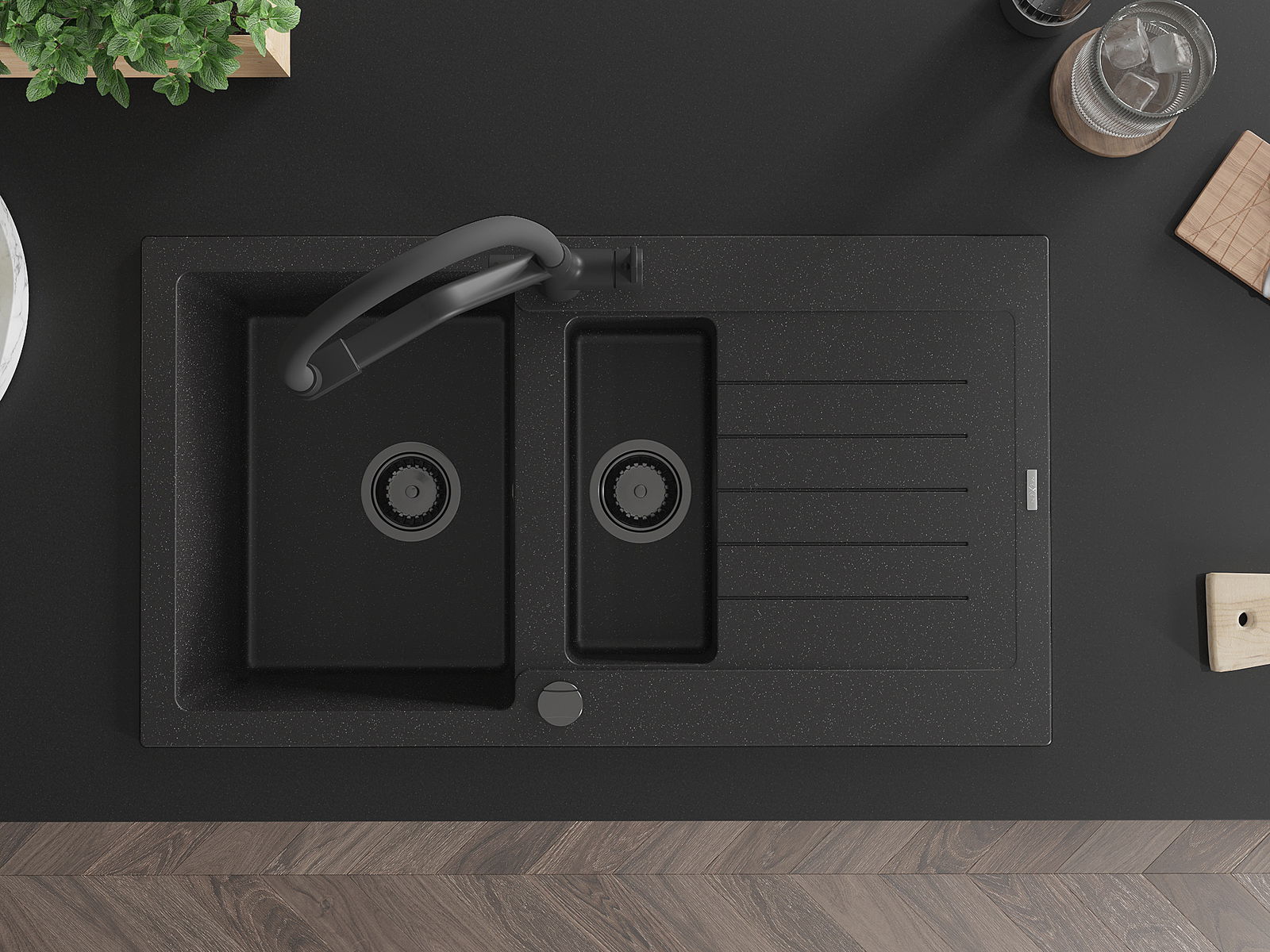 Mexen Matias zlewozmywak granitowy 1,5-komorowy z ociekaczem i baterią kuchenną Duo, czarny/srebrny - 6502-73-671701-70-B