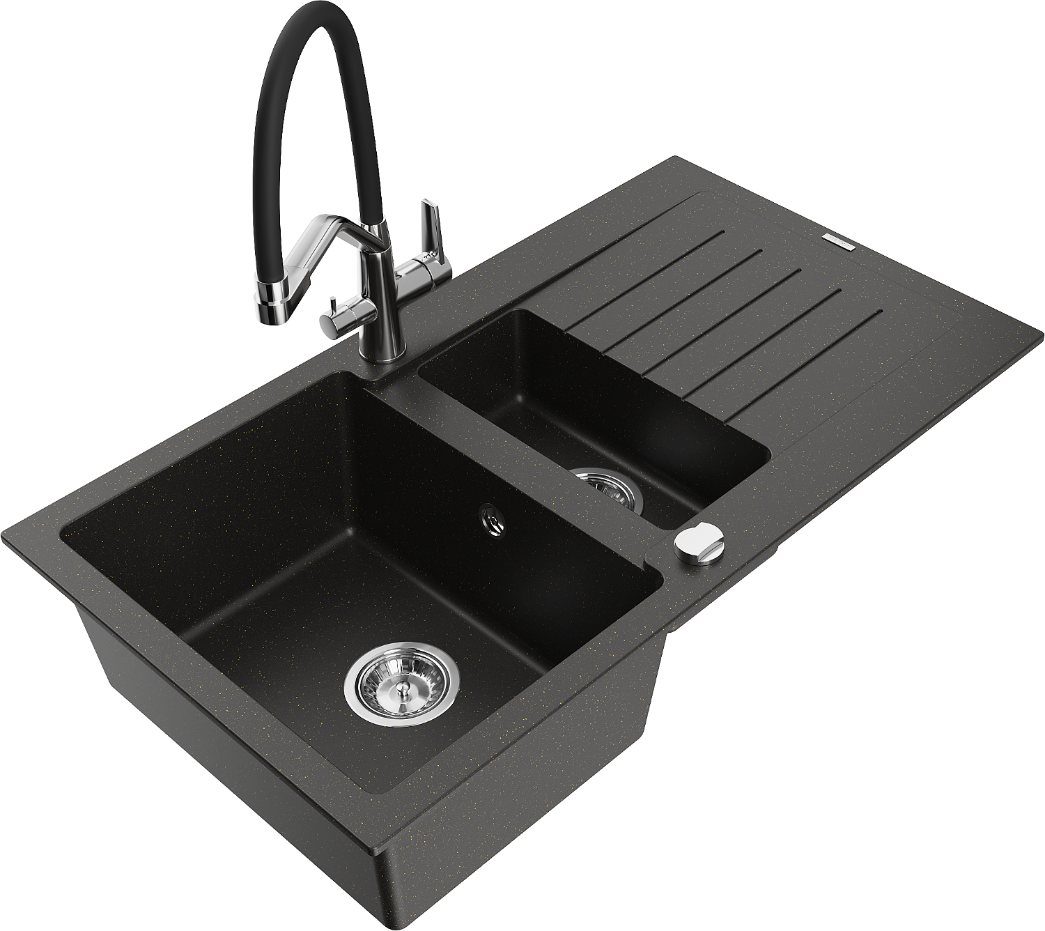Mexen Matias zlewozmywak granitowy 1,5-komorowy z ociekaczem i baterią kuchenną Duo, czarny/złoty metalik - 6502-75-671701-07