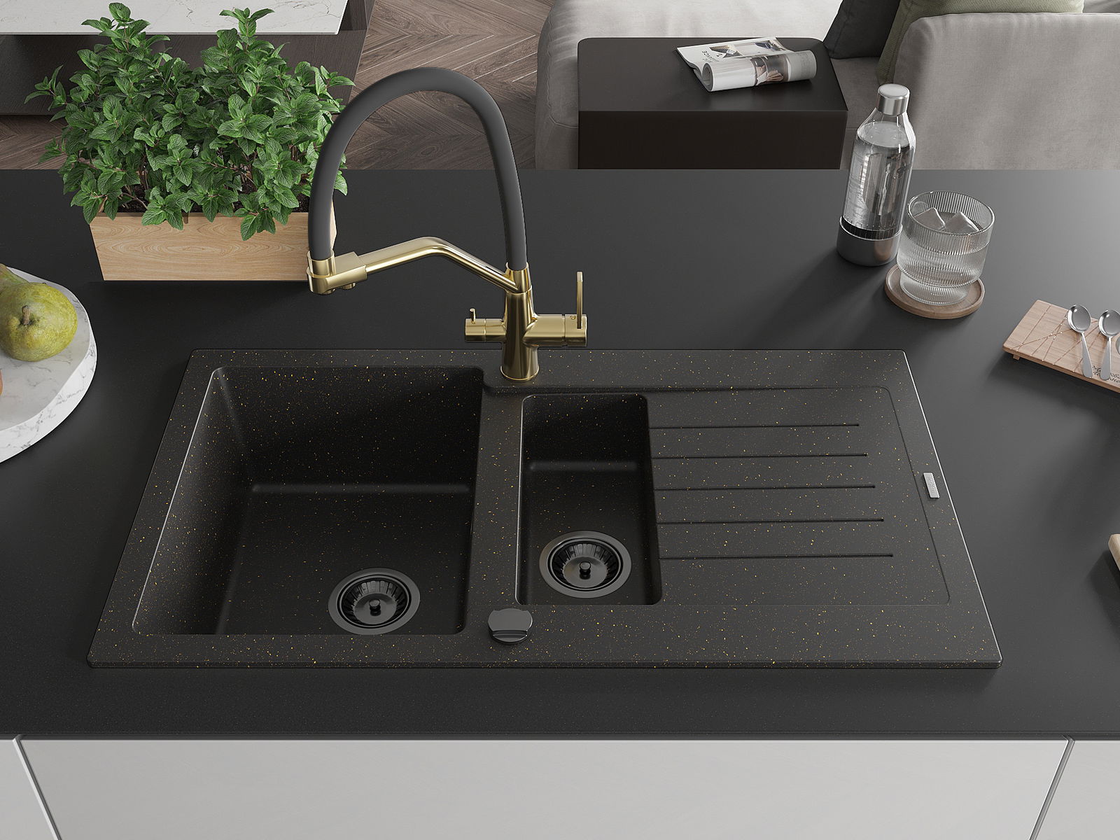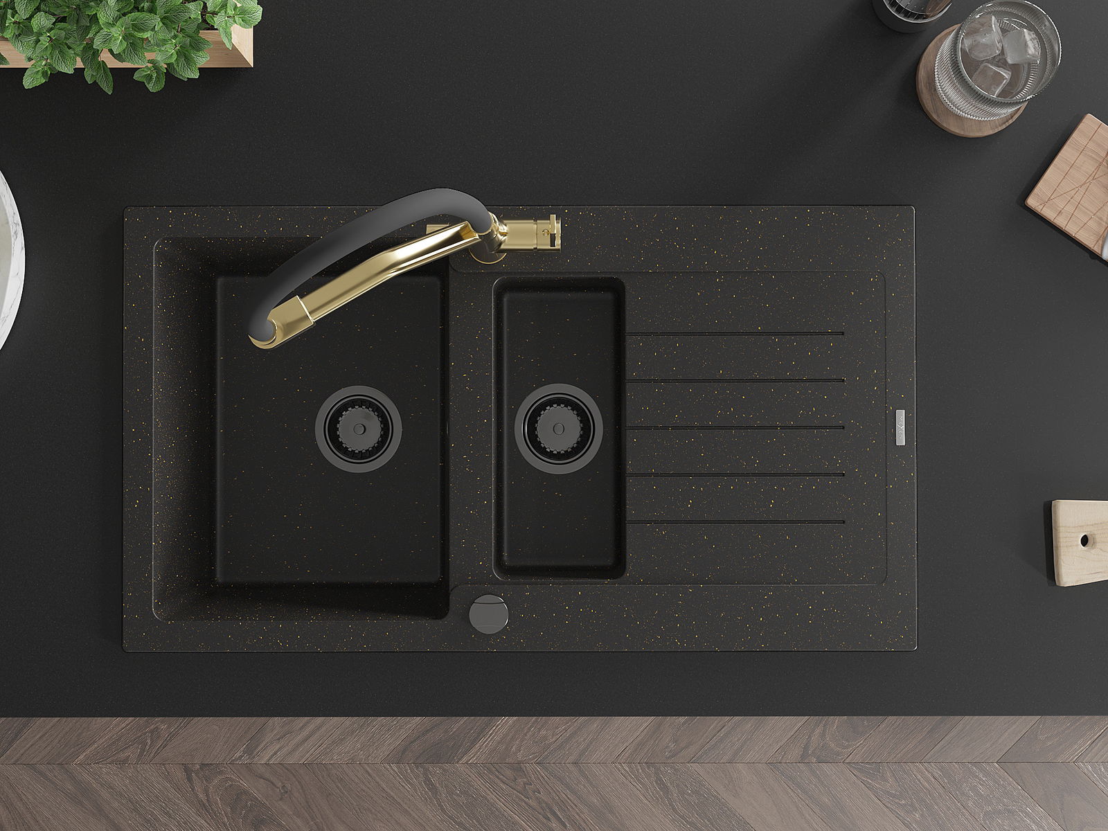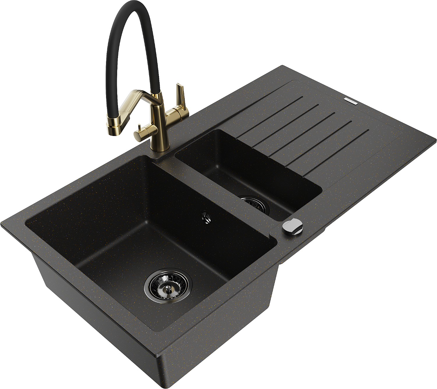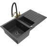 Mexen Matias zlewozmywak granitowy 1,5-komorowy z ociekaczem i baterią kuchenną Duo, czarny/złoty metalik - 6502-75-671701-57-B