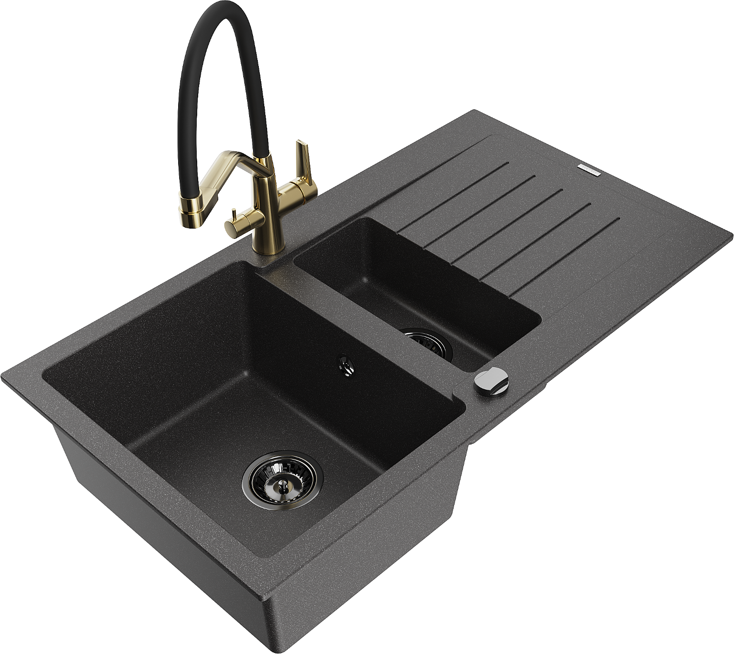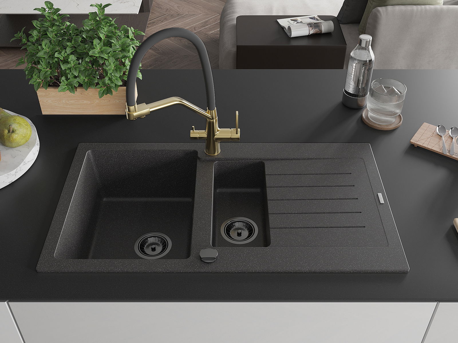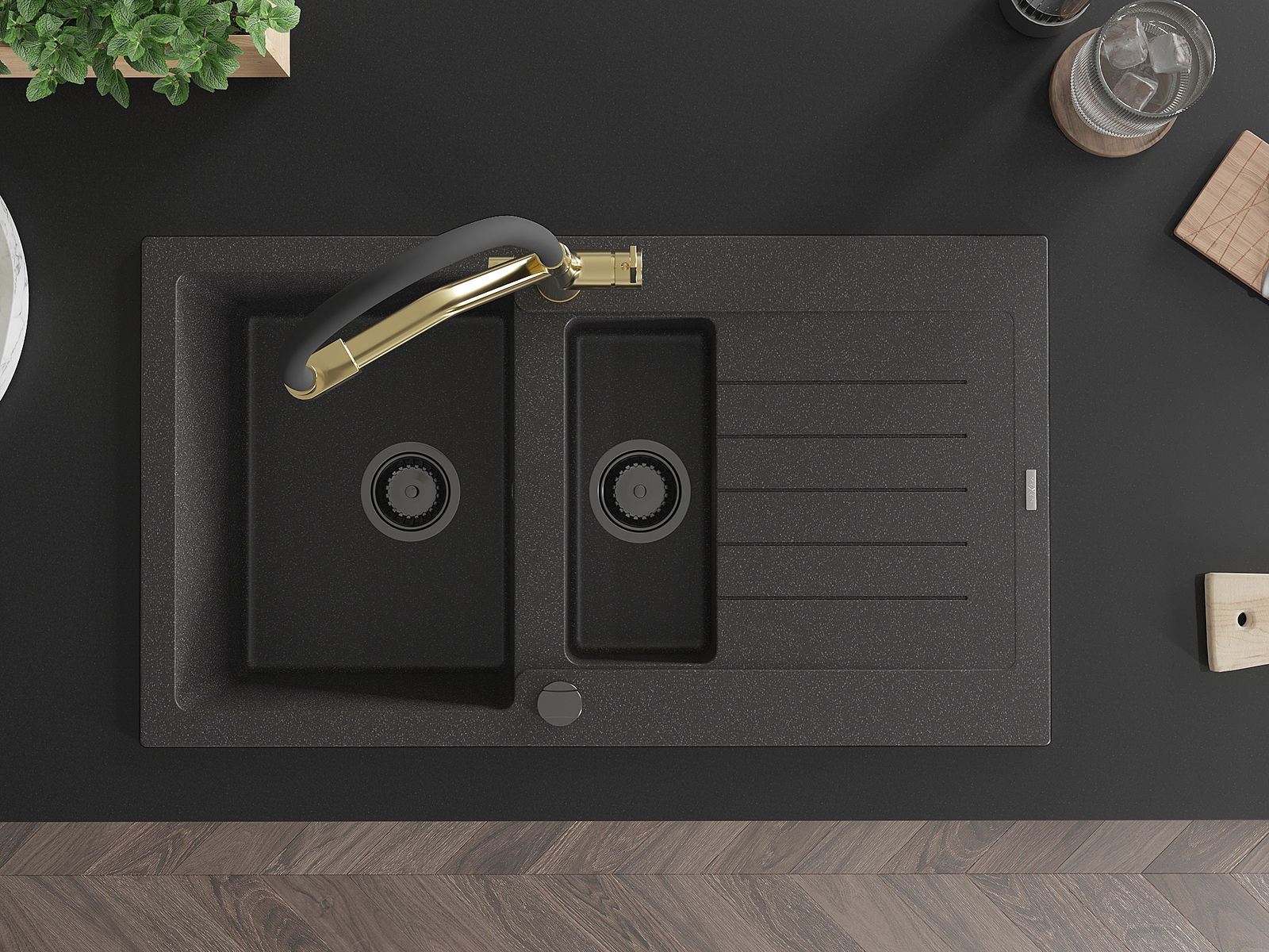 Mexen Matias zlewozmywak granitowy 1,5-komorowy z ociekaczem i baterią kuchenną Duo, czarny nakrapiany - 6502-76-671701-57-B