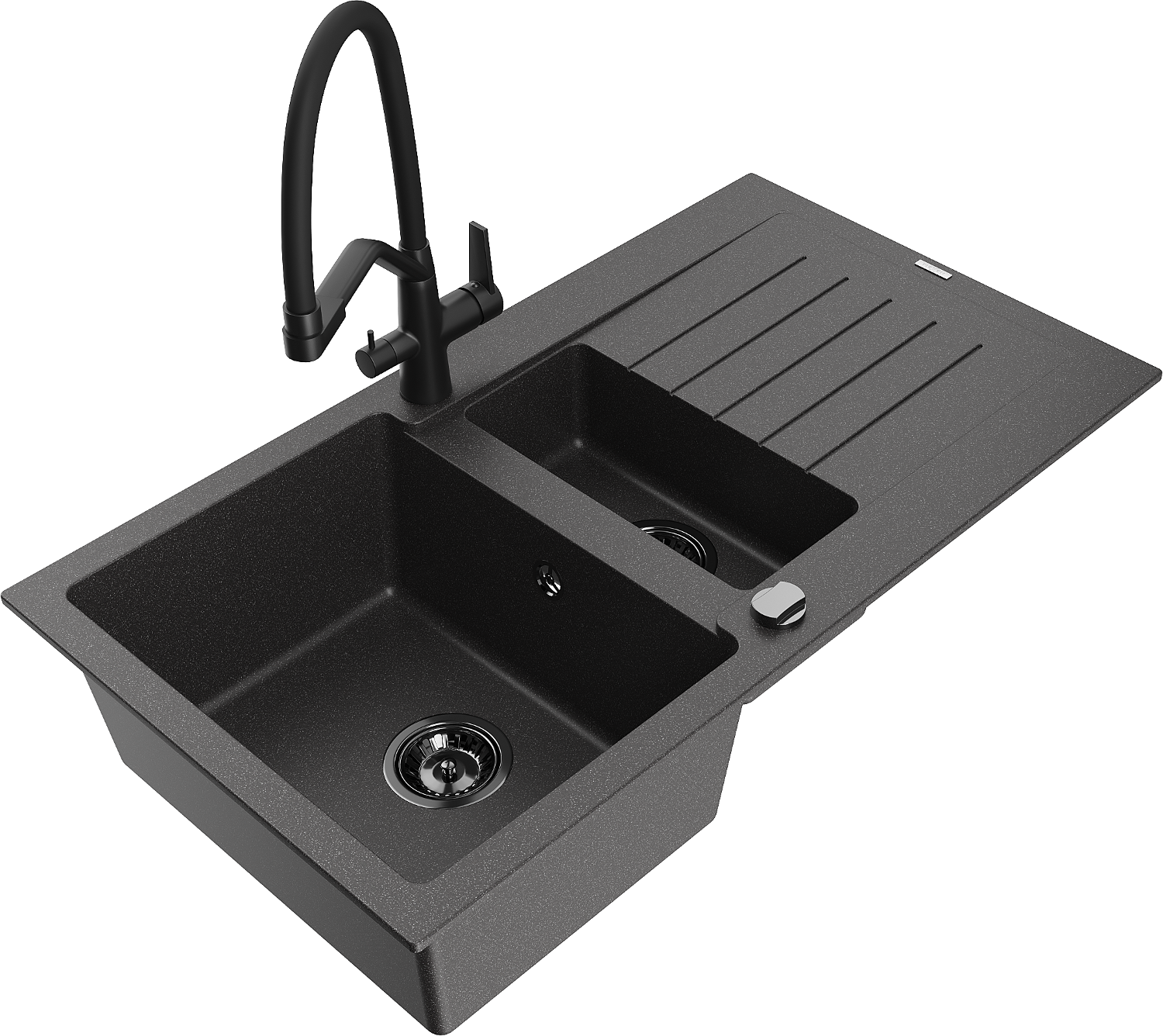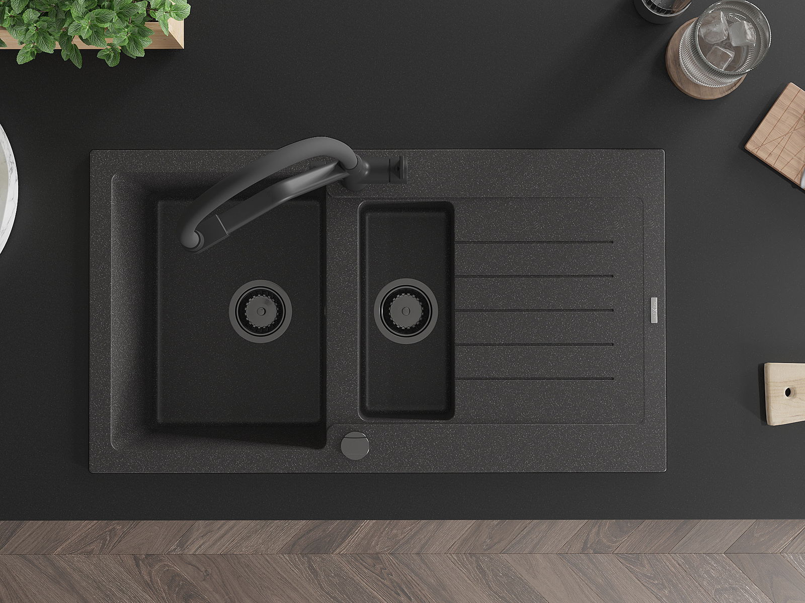 Mexen Matias zlewozmywak granitowy 1,5-komorowy z ociekaczem i baterią kuchenną Duo, czarny nakrapiany - 6502-76-671701-70-B