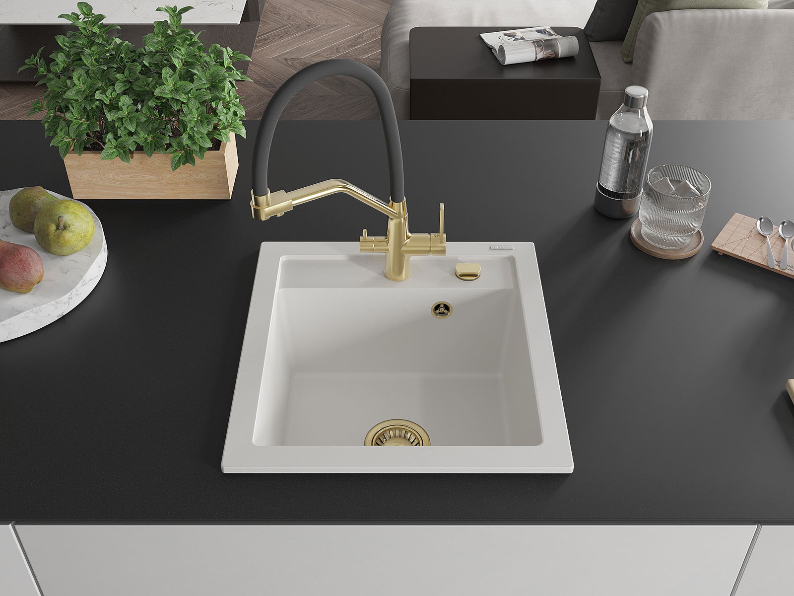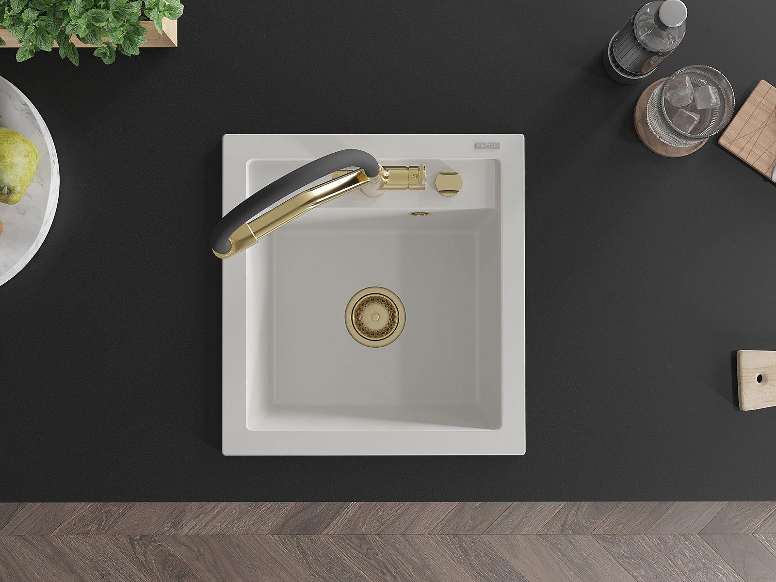 Zlew posiada podfrezowany otwór o średnicy 35 mm do samodzielnego wybicia. Można go wykorzystać m.in. do montażu dozownika na płyn, który wyeliminuje obecność plastikowych butelek w kuchni i nada jej eleganckiego wykończenia.