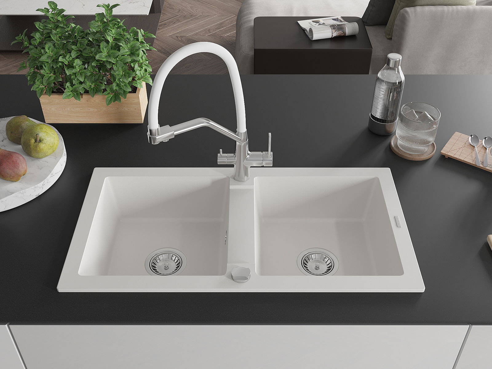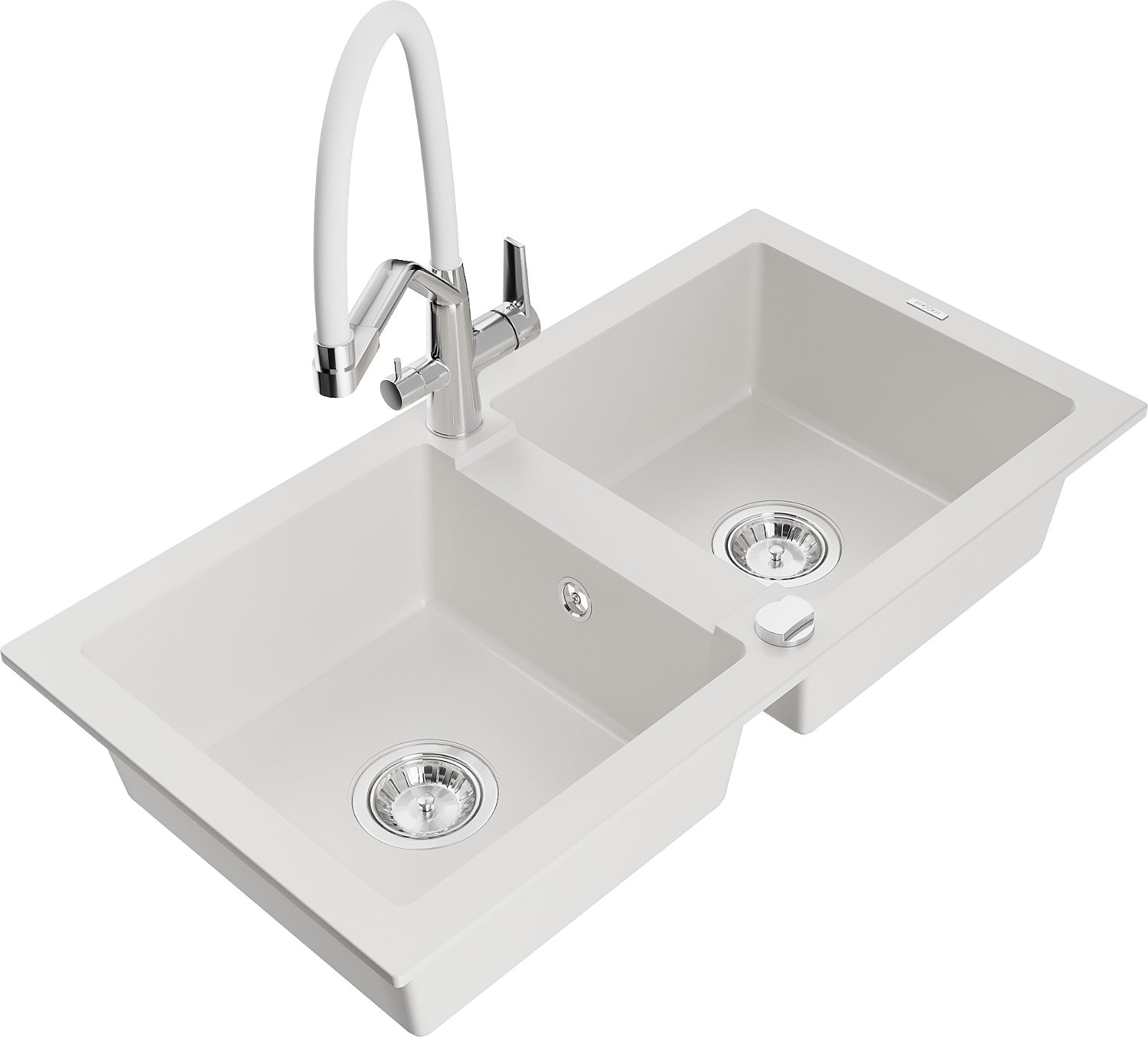 Mexen Mario zlewozmywak granitowy 2-komorowy z baterią kuchenną Duo, biały - 6504-20-671701-02