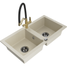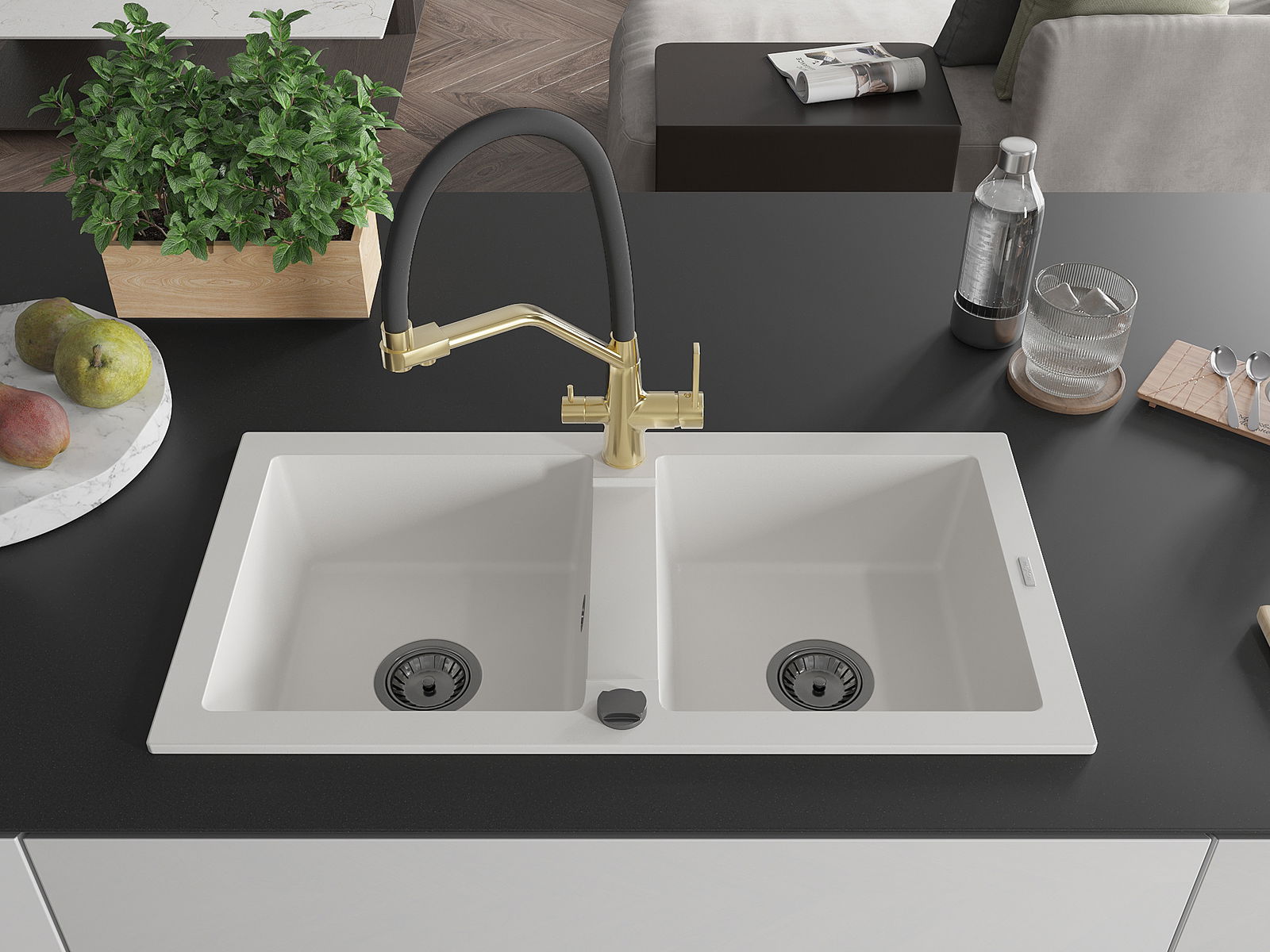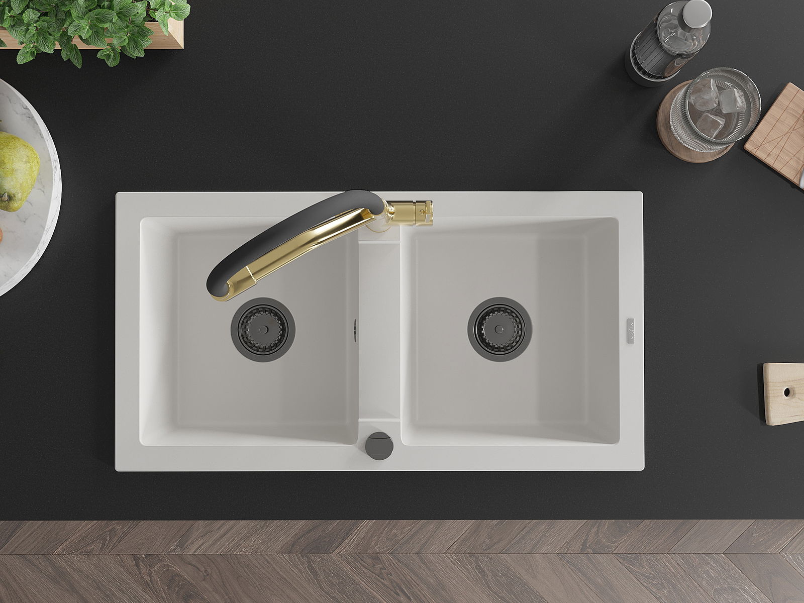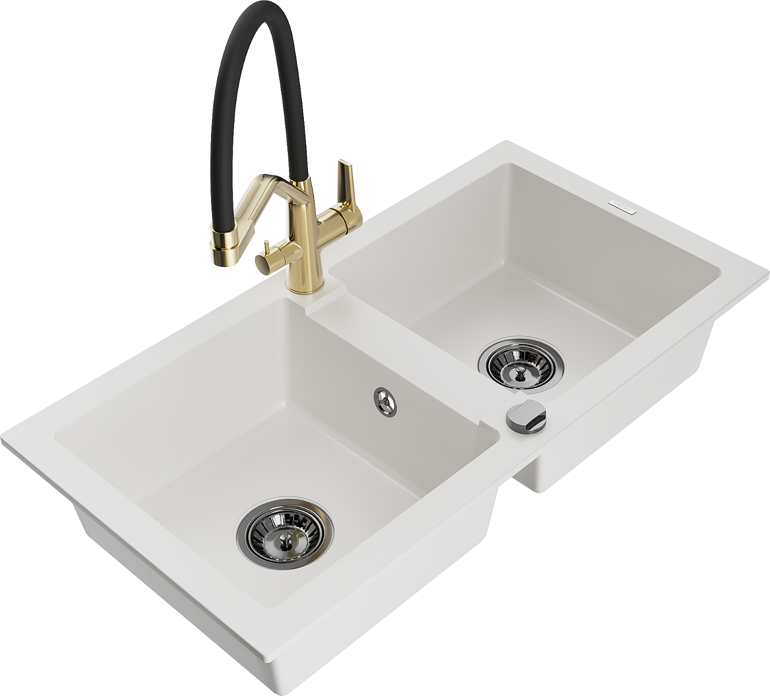 Mexen Mario zlewozmywak granitowy 2-komorowy z baterią kuchenną Duo, biały - 6504-20-671701-57-B