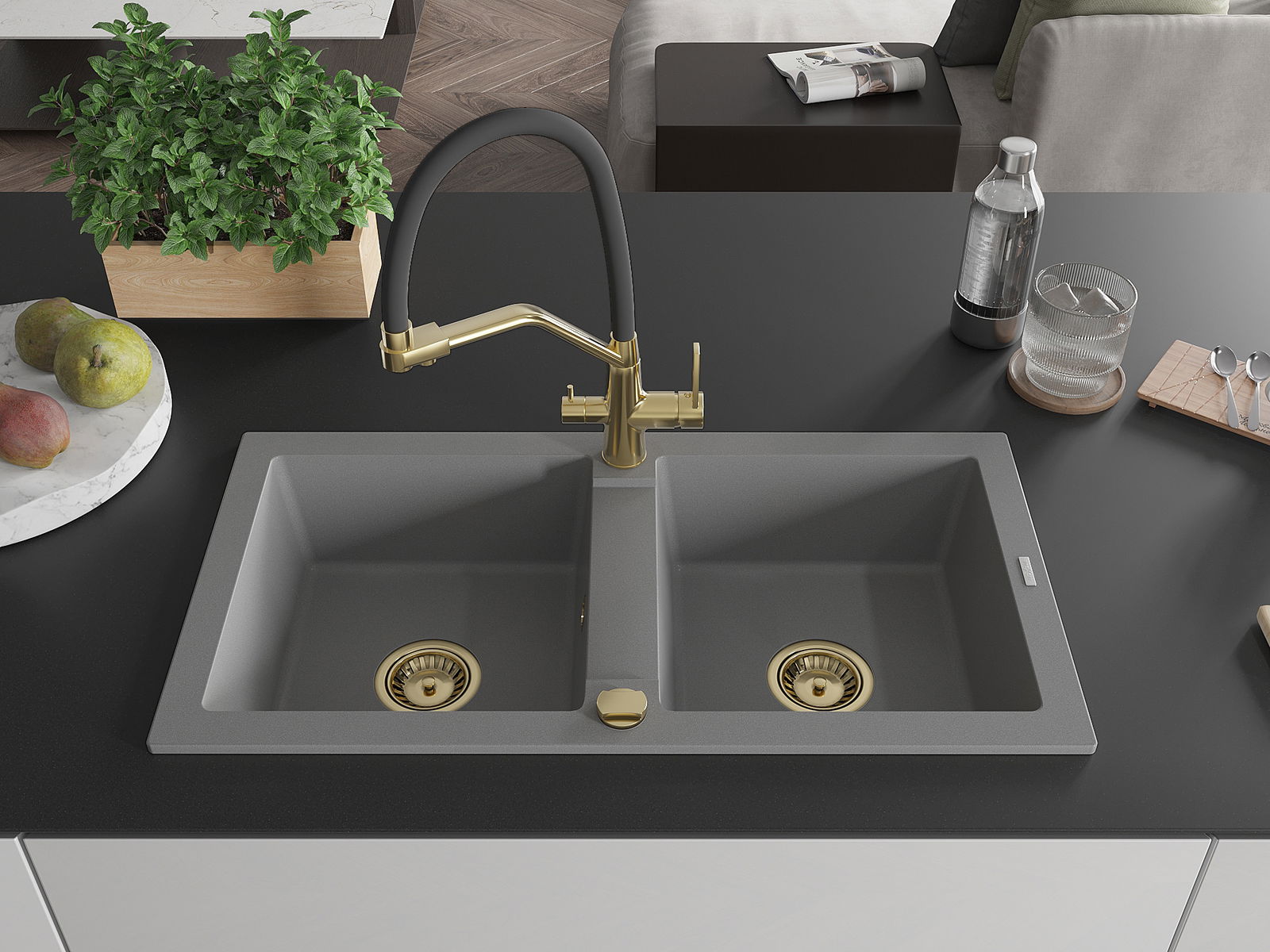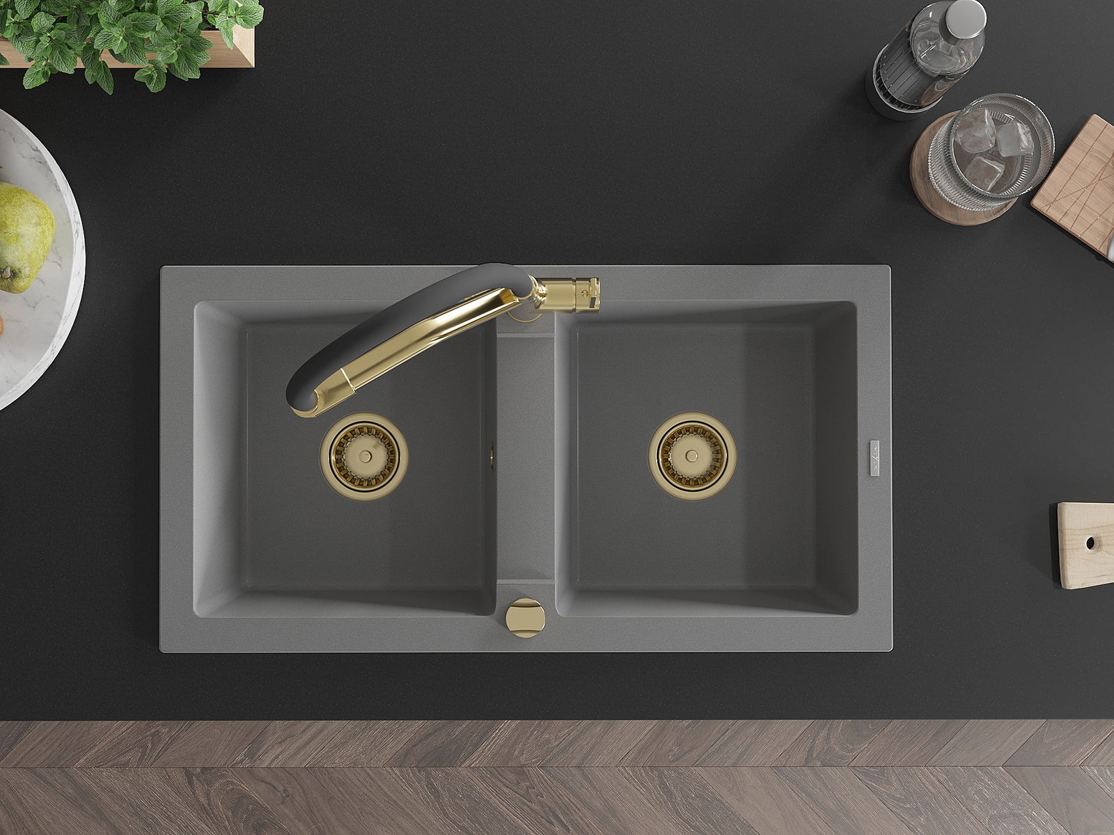 Mexen Mario zlewozmywak granitowy 2-komorowy z baterią kuchenną Duo, szary - 6504-71-671701-57-G