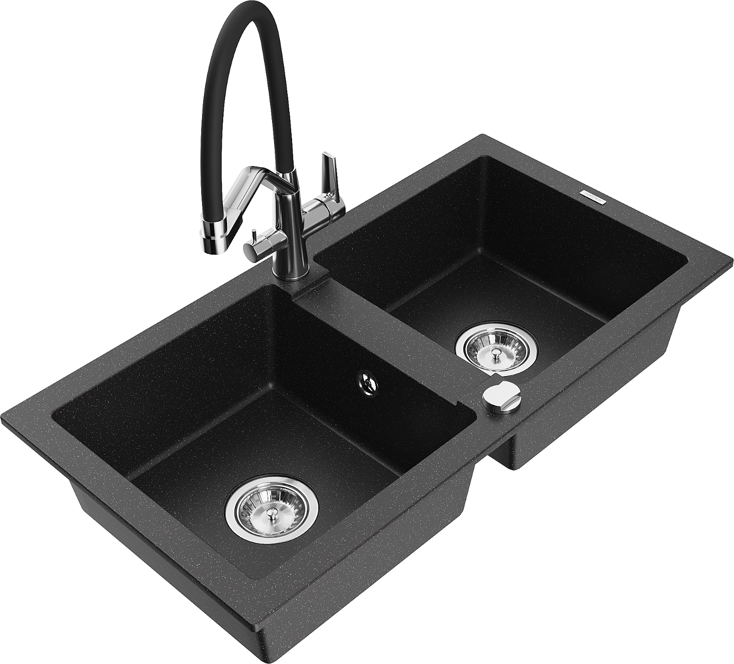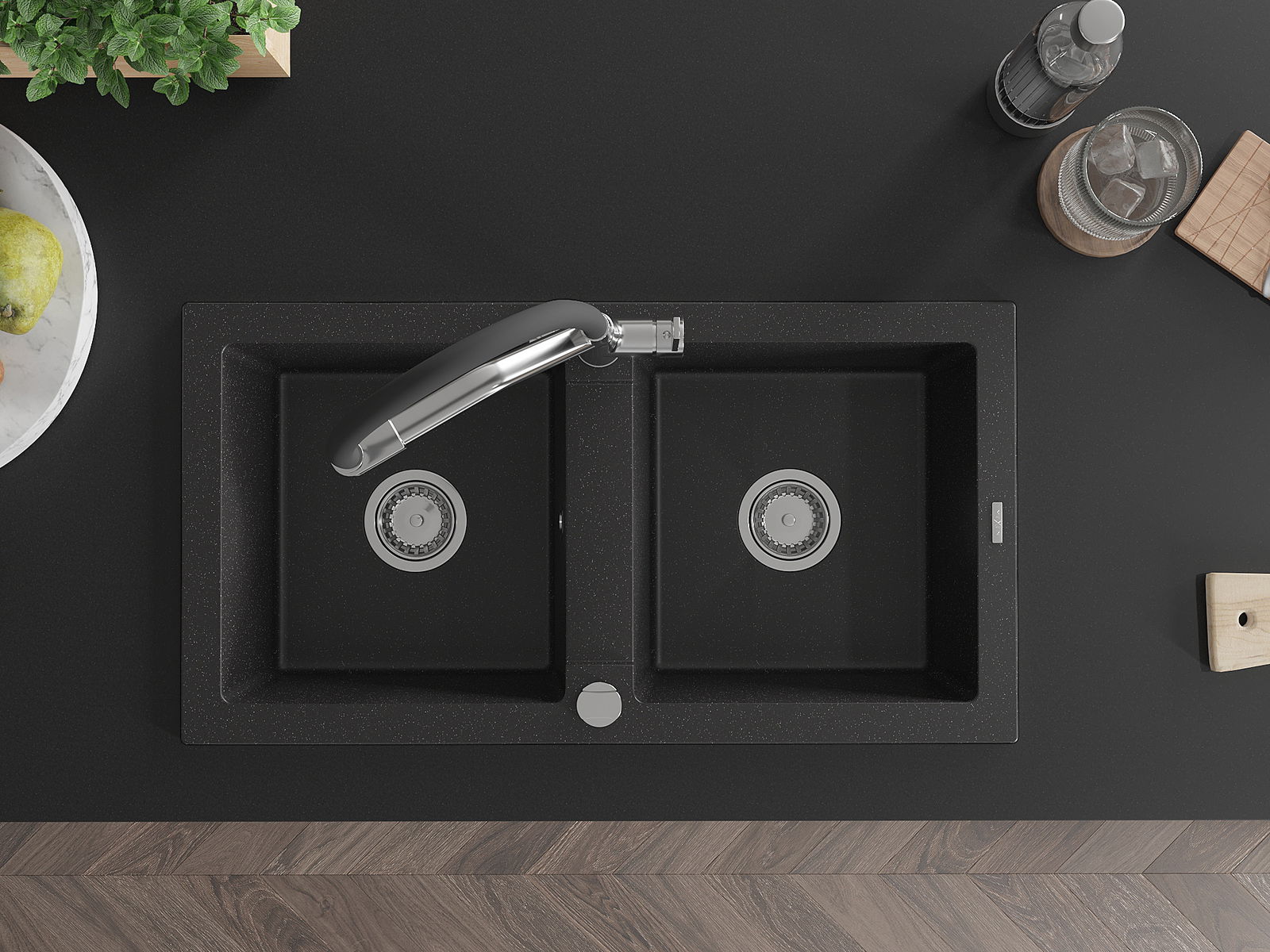 Mexen Mario zlewozmywak granitowy 2-komorowy z baterią kuchenną Duo, czarny/srebrny metalik - 6504-73-671701-07