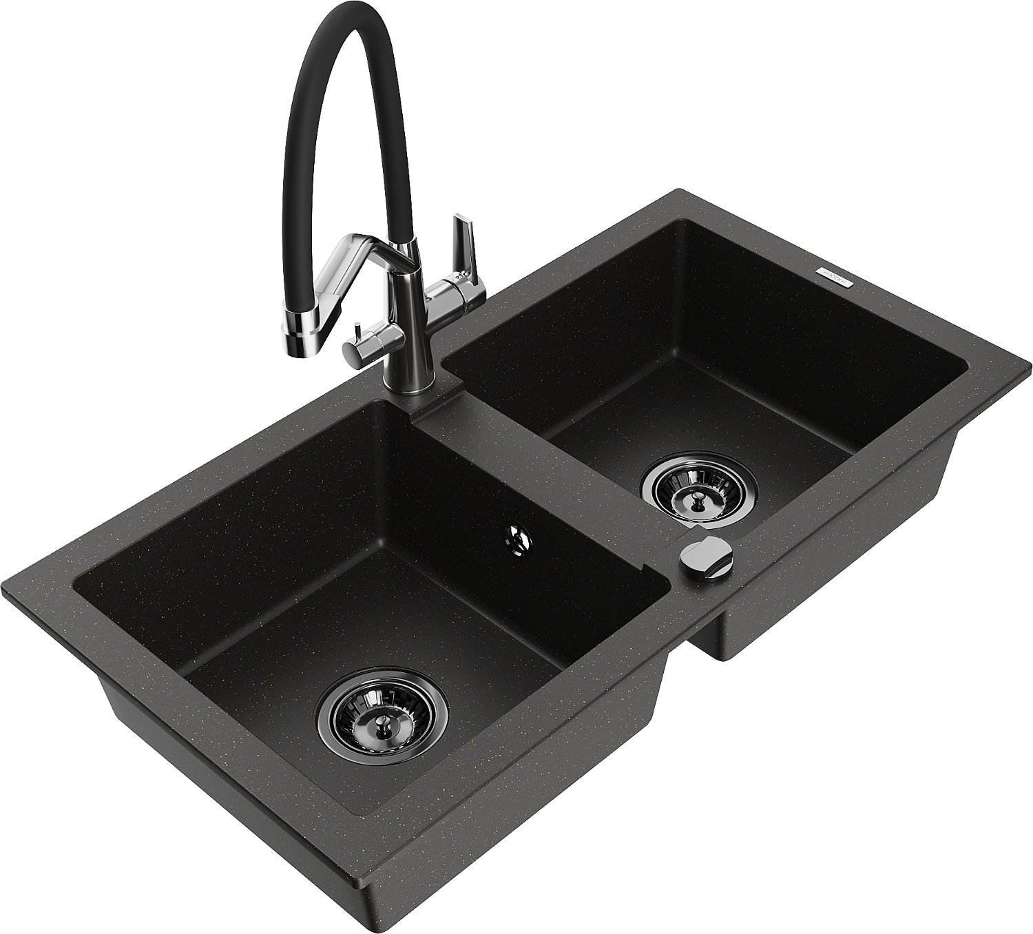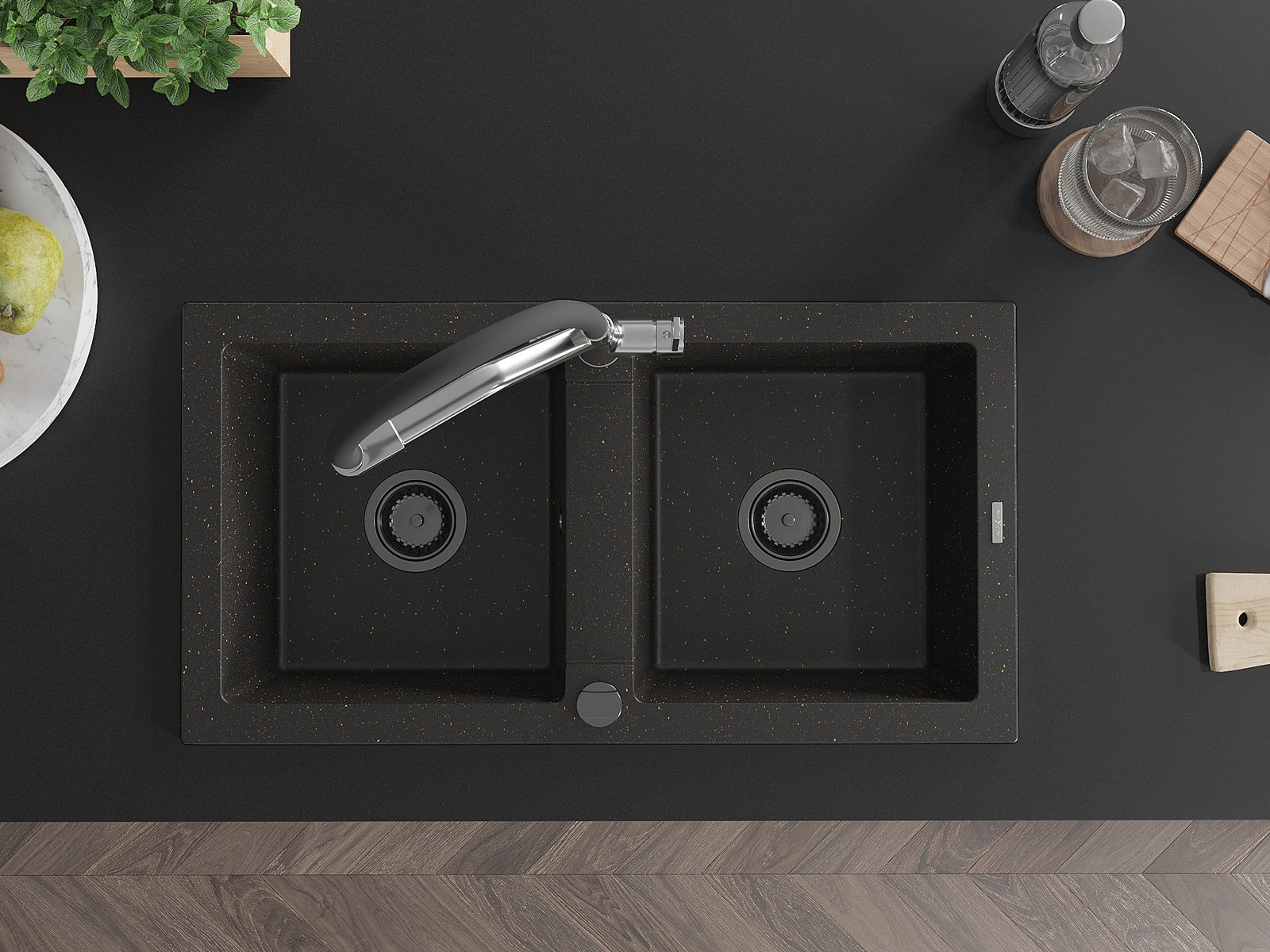 Mexen Mario zlewozmywak granitowy 2-komorowy z baterią kuchenną Duo, czarny/złoty metalik - 6504-75-671701-07-B