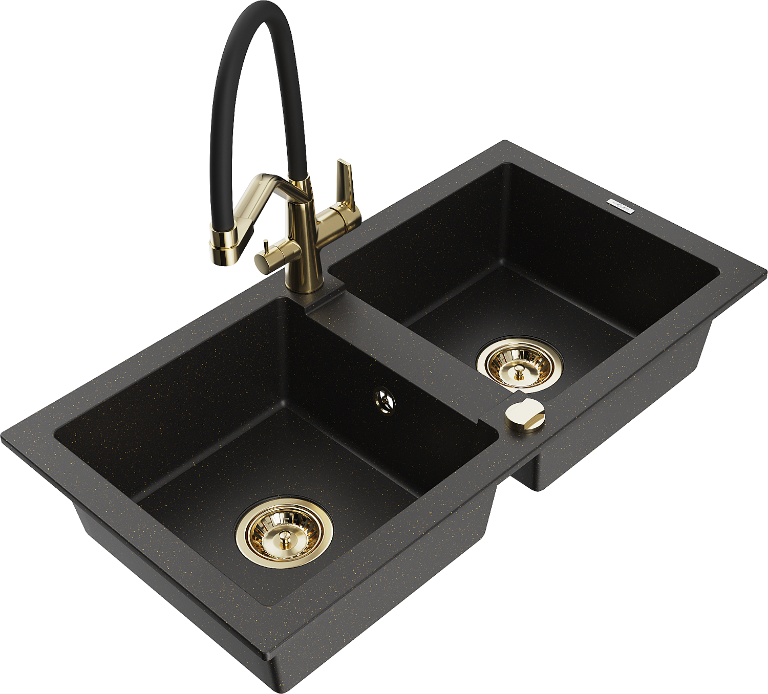 Mexen Mario zlewozmywak granitowy 2-komorowy z baterią kuchenną Duo, czarny/złoty metalik - 6504-75-671701-57-G
