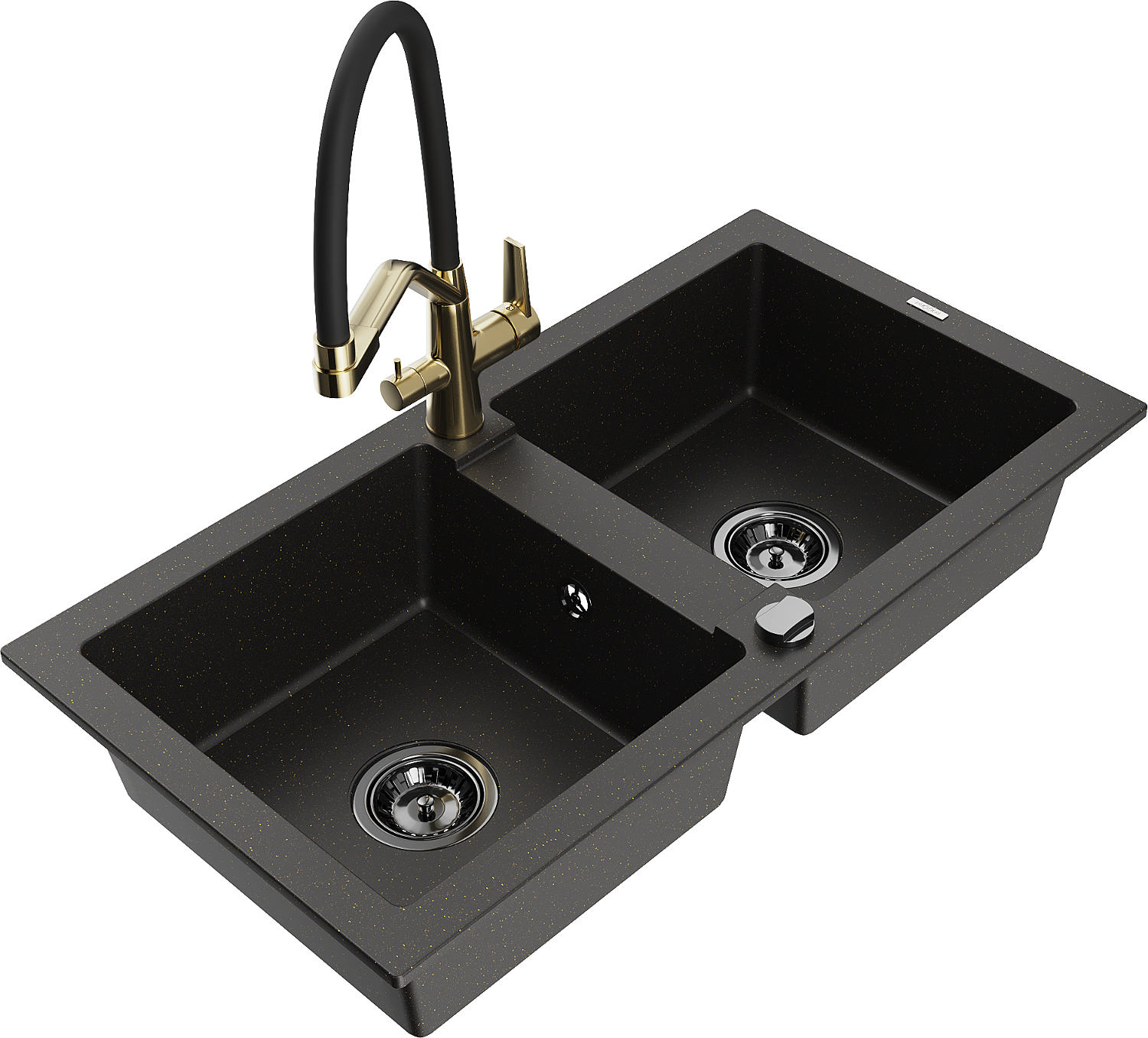 Mexen Mario zlewozmywak granitowy 2-komorowy z baterią kuchenną Duo, czarny/złoty metalik - 6504-75-671701-57-B