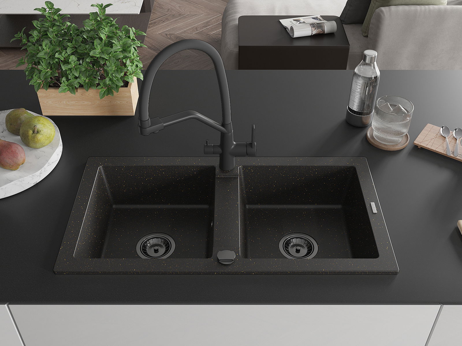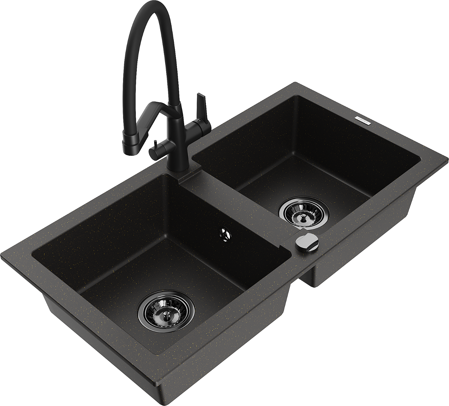 Mexen Mario zlewozmywak granitowy 2-komorowy z baterią kuchenną Duo, czarny/złoty metalik - 6504-75-671701-70-B