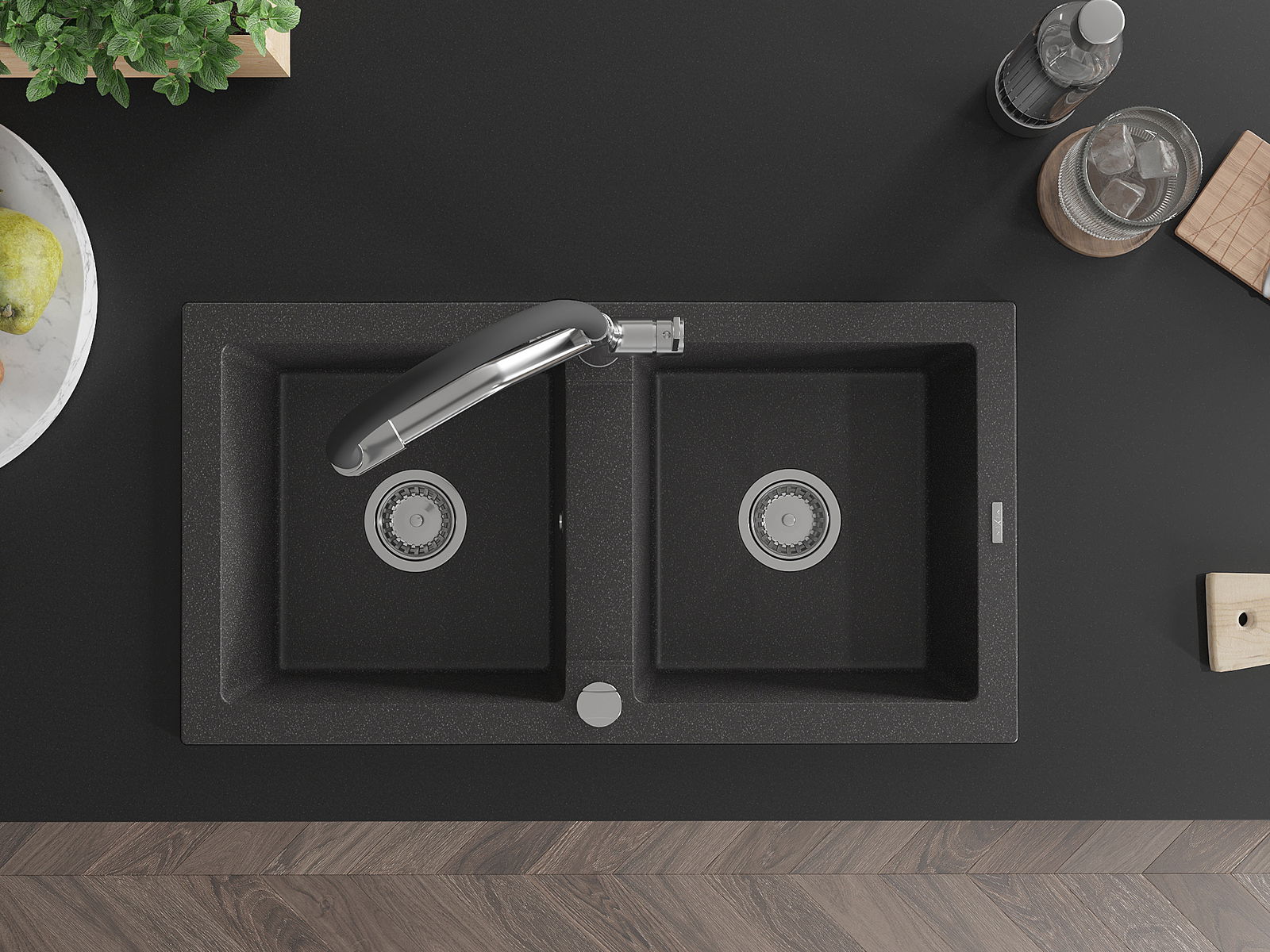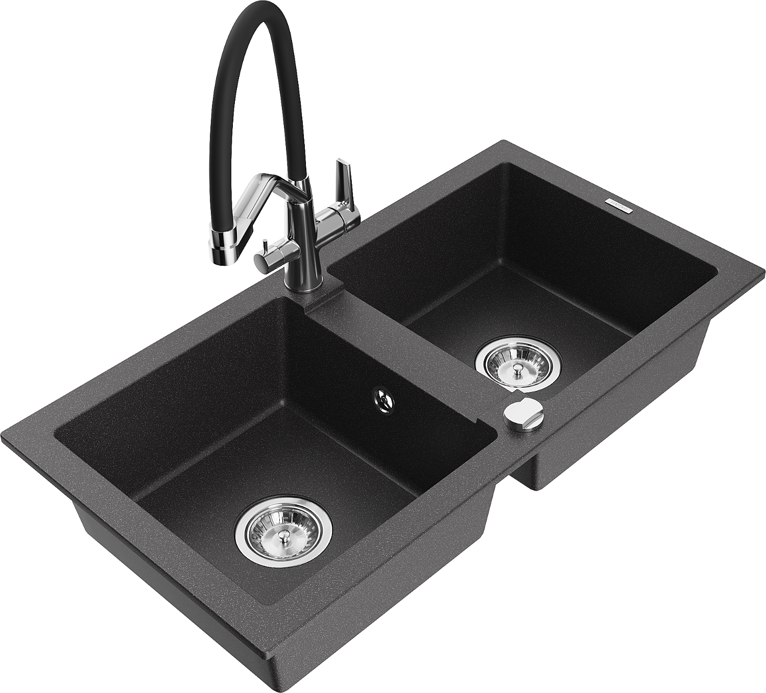 Mexen Mario zlewozmywak granitowy 2-komorowy z baterią kuchenną Duo, czarny nakrapiany - 6504-76-671701-07