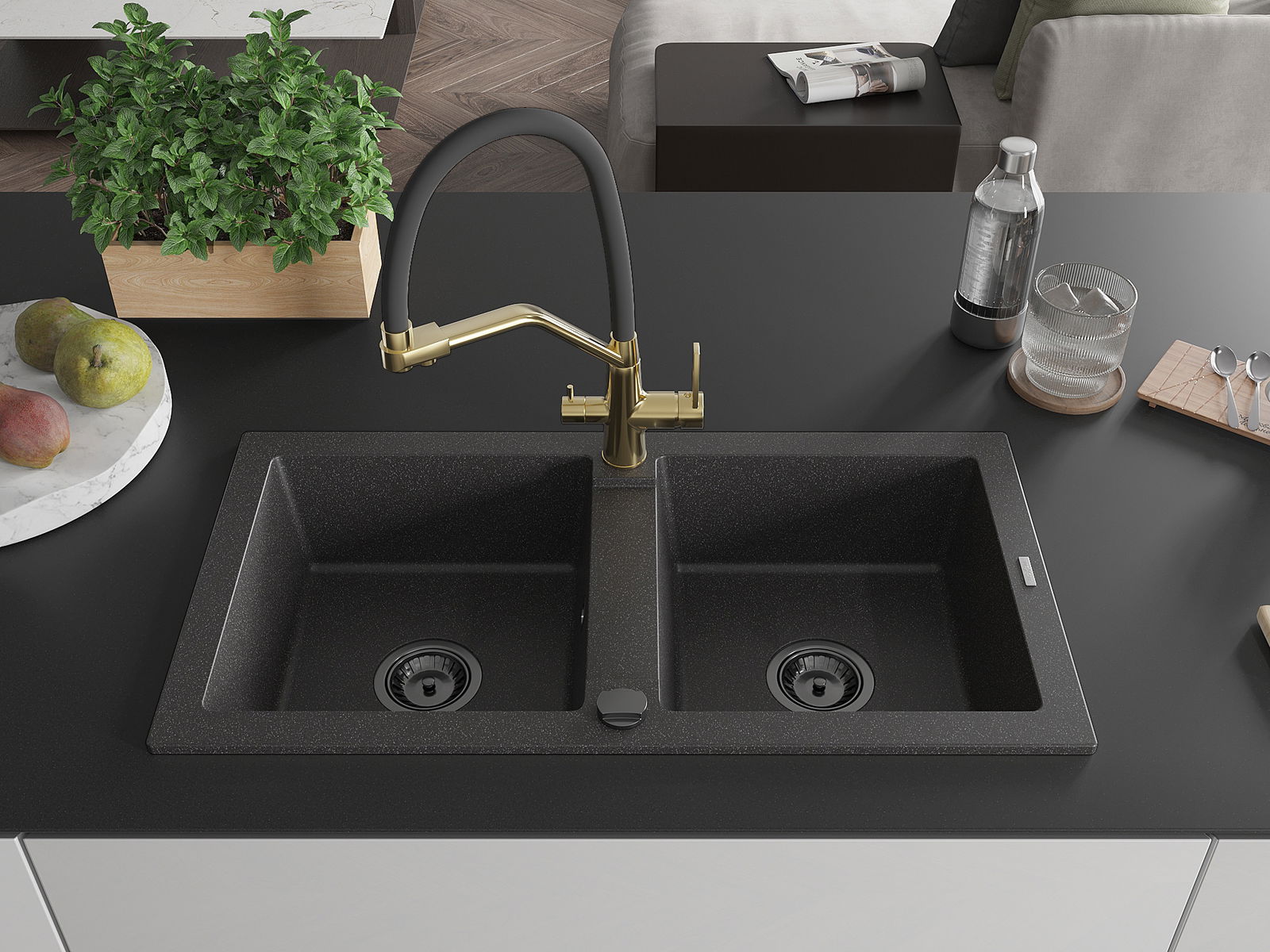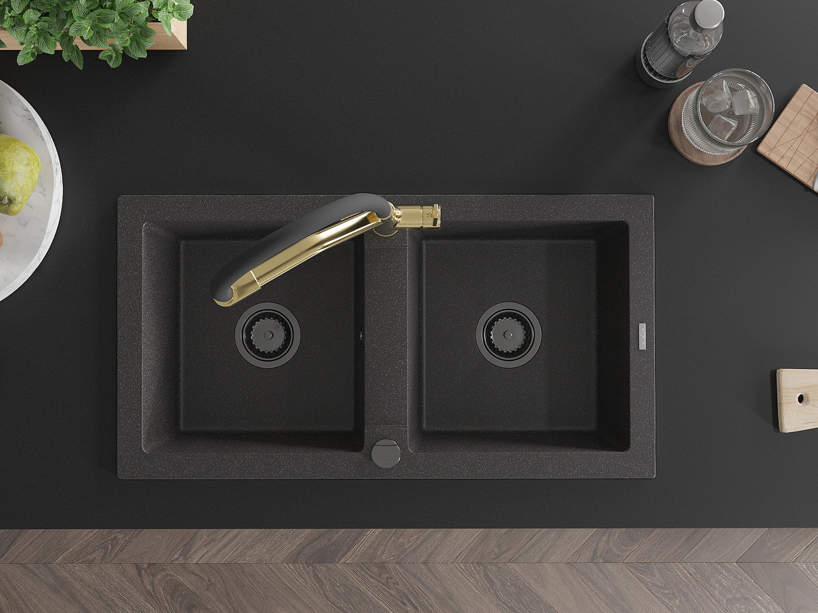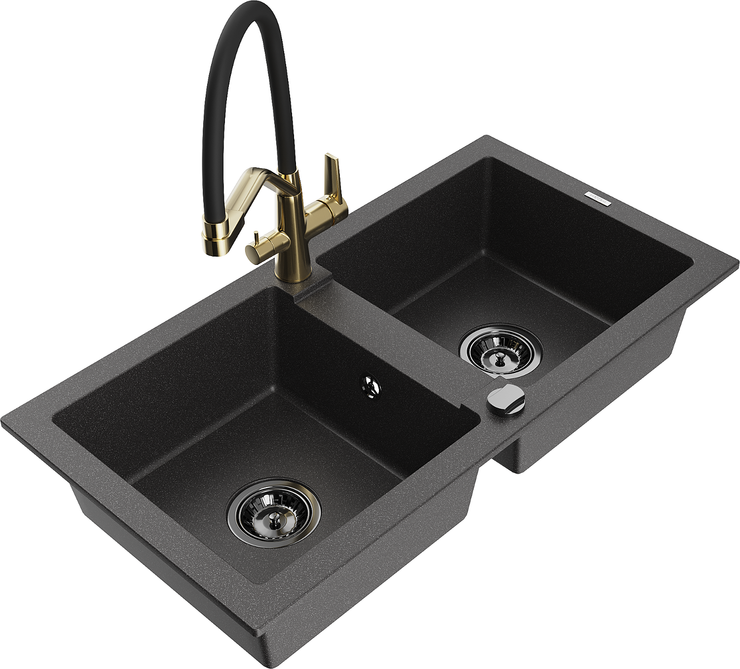 Mexen Mario zlewozmywak granitowy 2-komorowy z baterią kuchenną Duo, czarny nakrapiany - 6504-76-671701-57-B