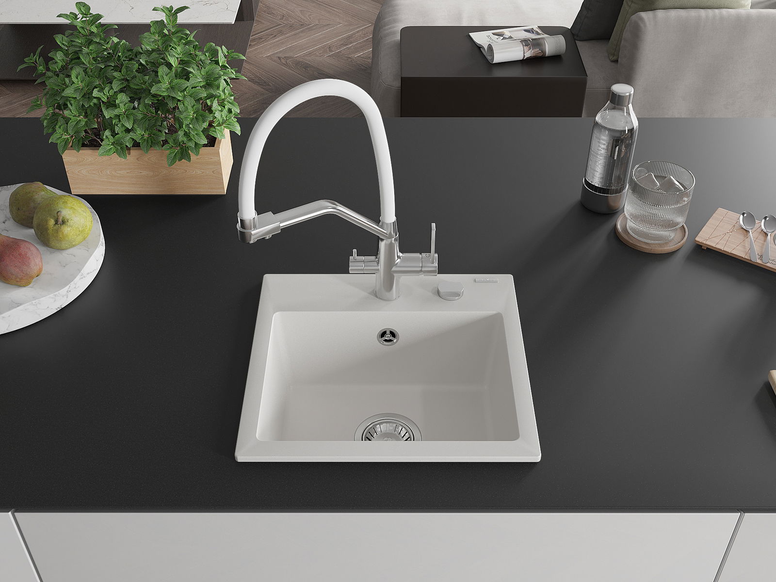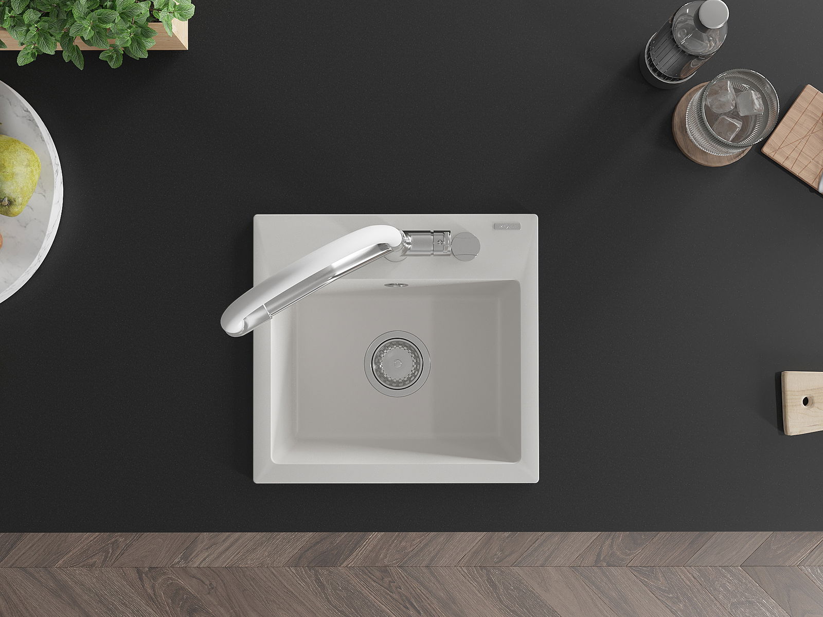 Zlew posiada podfrezowany otwór o średnicy 35 mm do samodzielnego wybicia. Można go wykorzystać m.in. do montażu dozownika na płyn, który wyeliminuje obecność plastikowych butelek w kuchni i nada jej eleganckiego wykończenia.