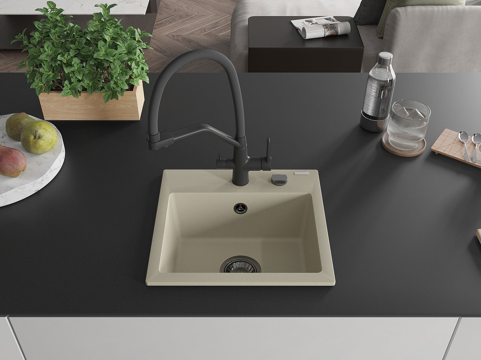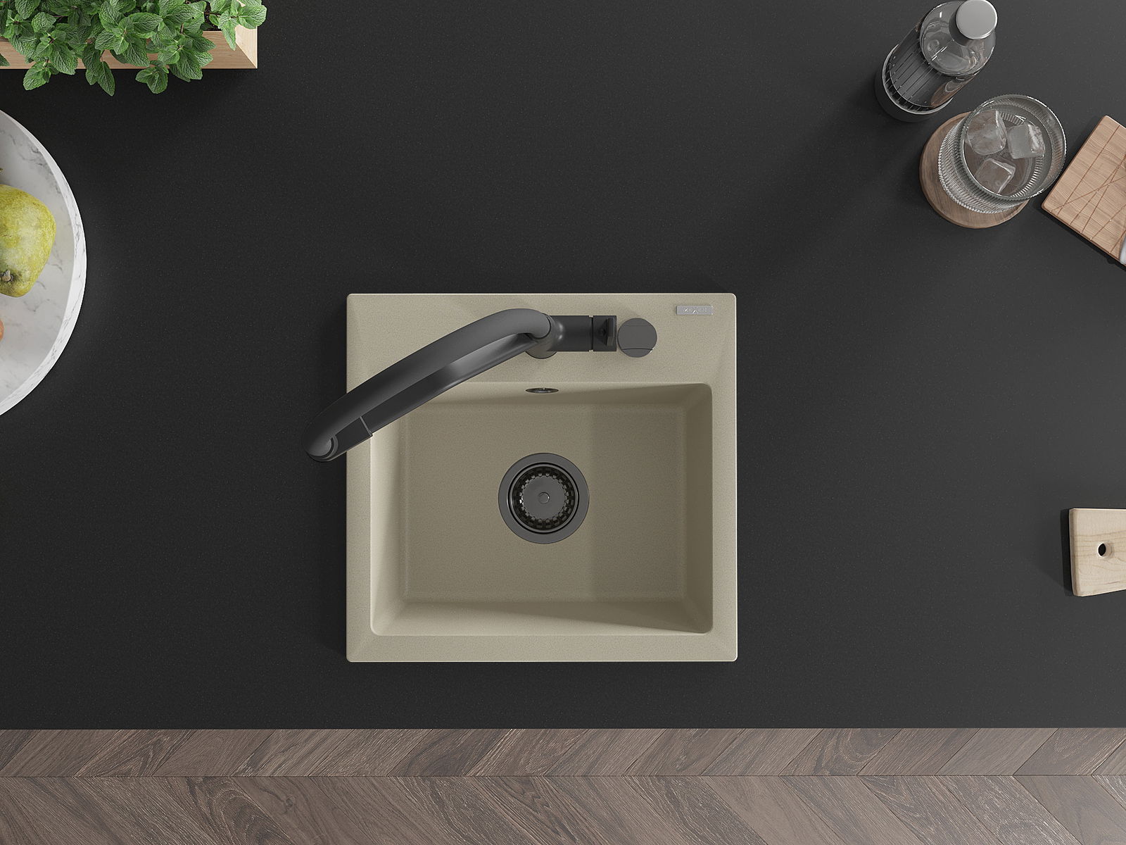 Zlew posiada podfrezowany otwór o średnicy 35 mm do samodzielnego wybicia. Można go wykorzystać m.in. do montażu dozownika na płyn, który wyeliminuje obecność plastikowych butelek w kuchni i nada jej eleganckiego wykończenia.