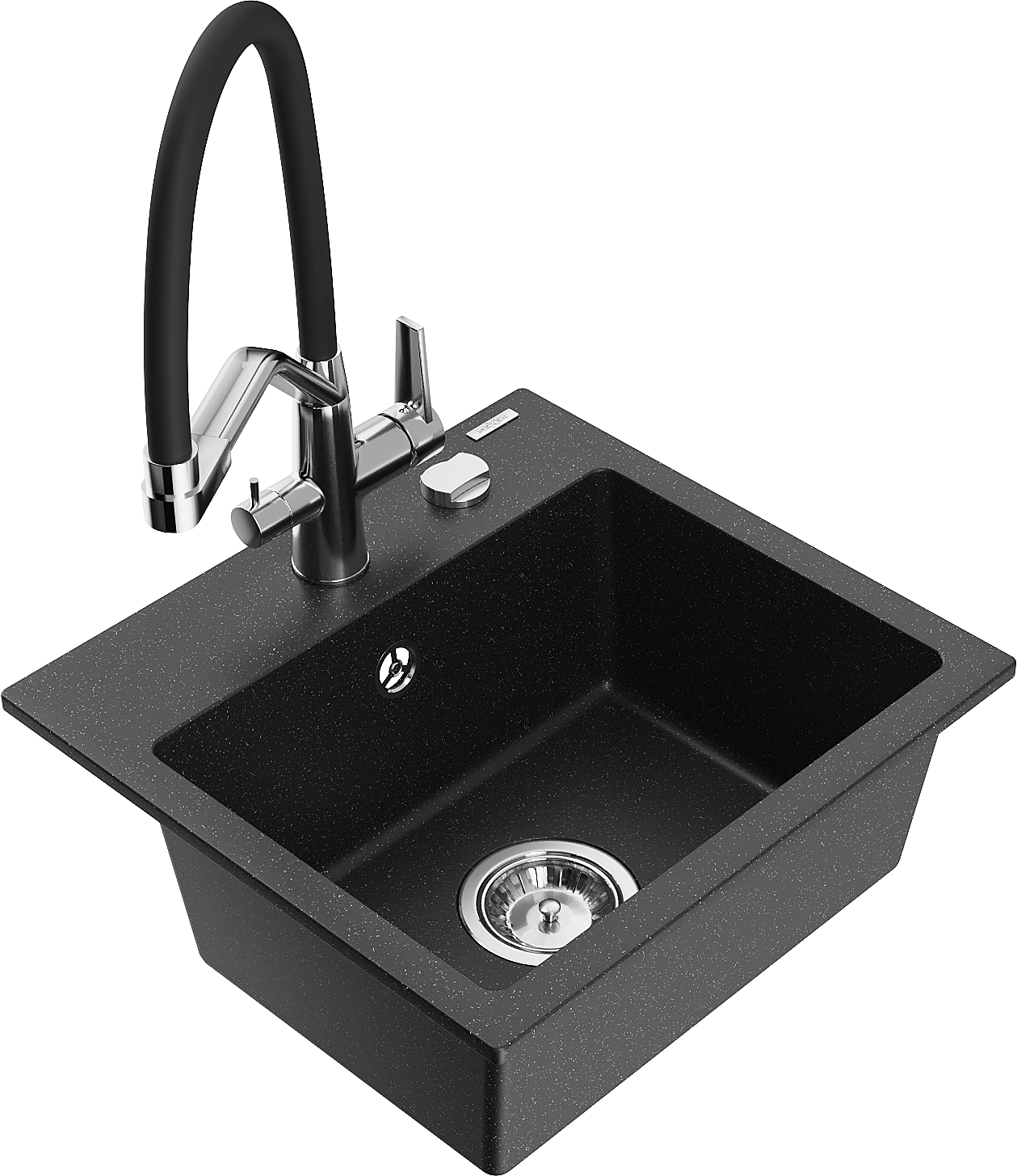 Mexen Milo zlewozmywak granitowy 1-komorowy z baterią kuchenną Duo, czarny/srebrny metalik - 6505-73-671701-07