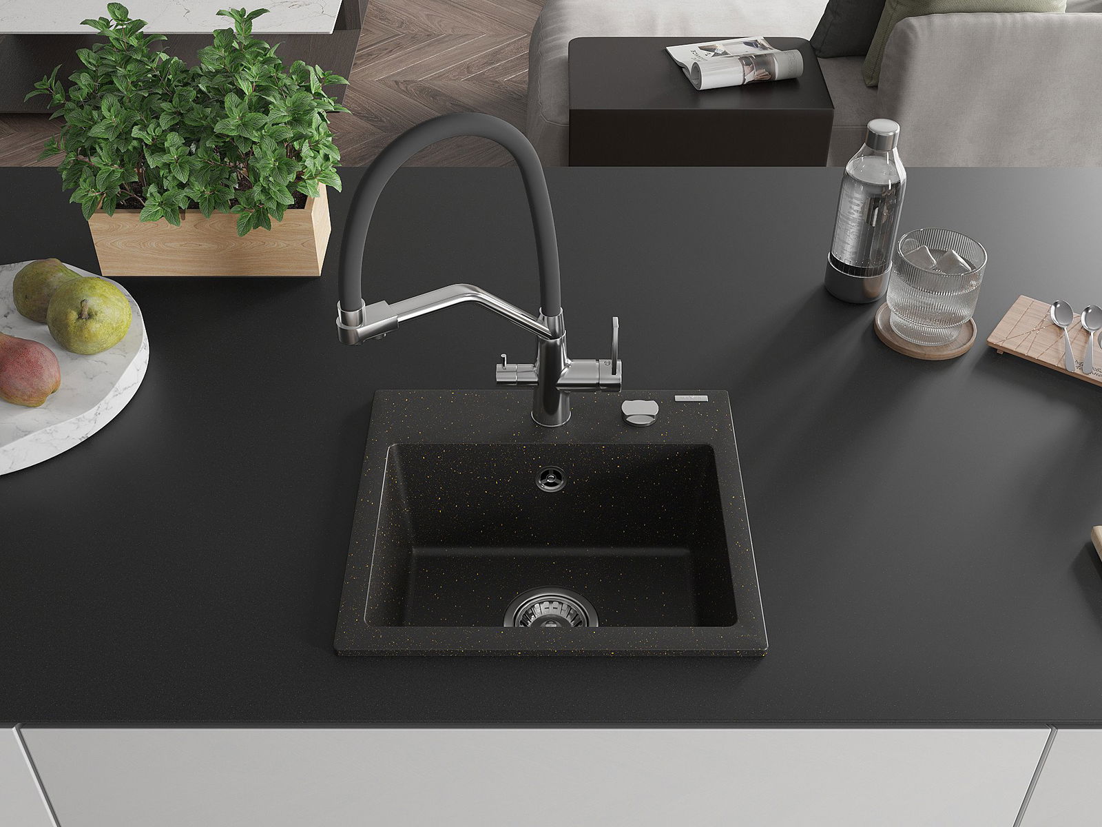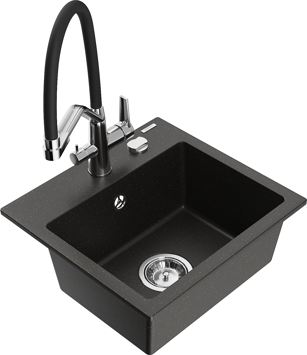 Mexen Milo zlewozmywak granitowy 1-komorowy z baterią kuchenną Duo, czarny/złoty metalik - 6505-75-671701-07