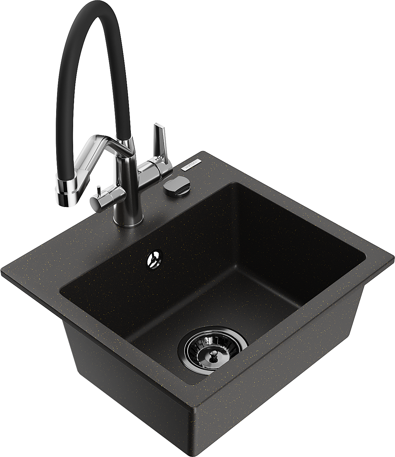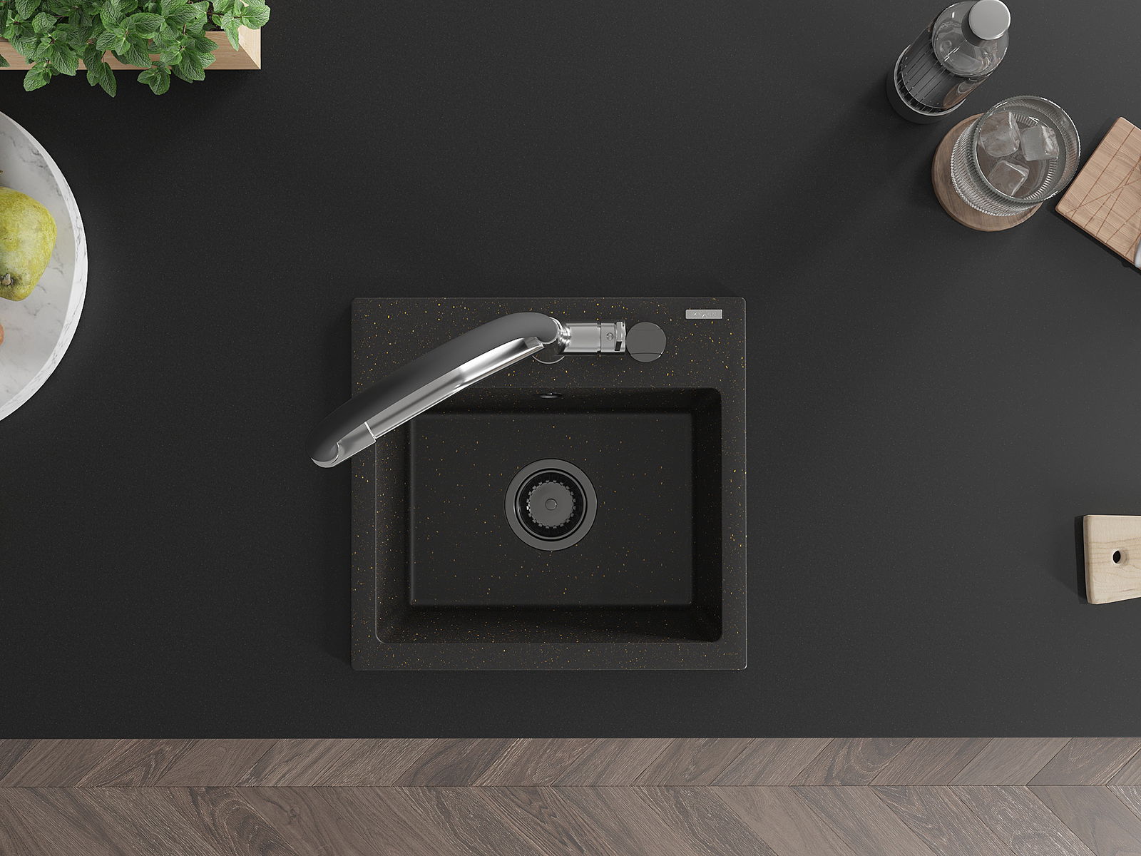 Mexen Milo zlewozmywak granitowy 1-komorowy z baterią kuchenną Duo, czarny/złoty metalik - 6505-75-671701-07-B