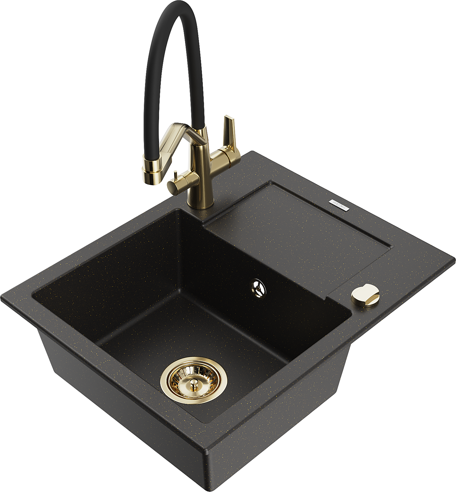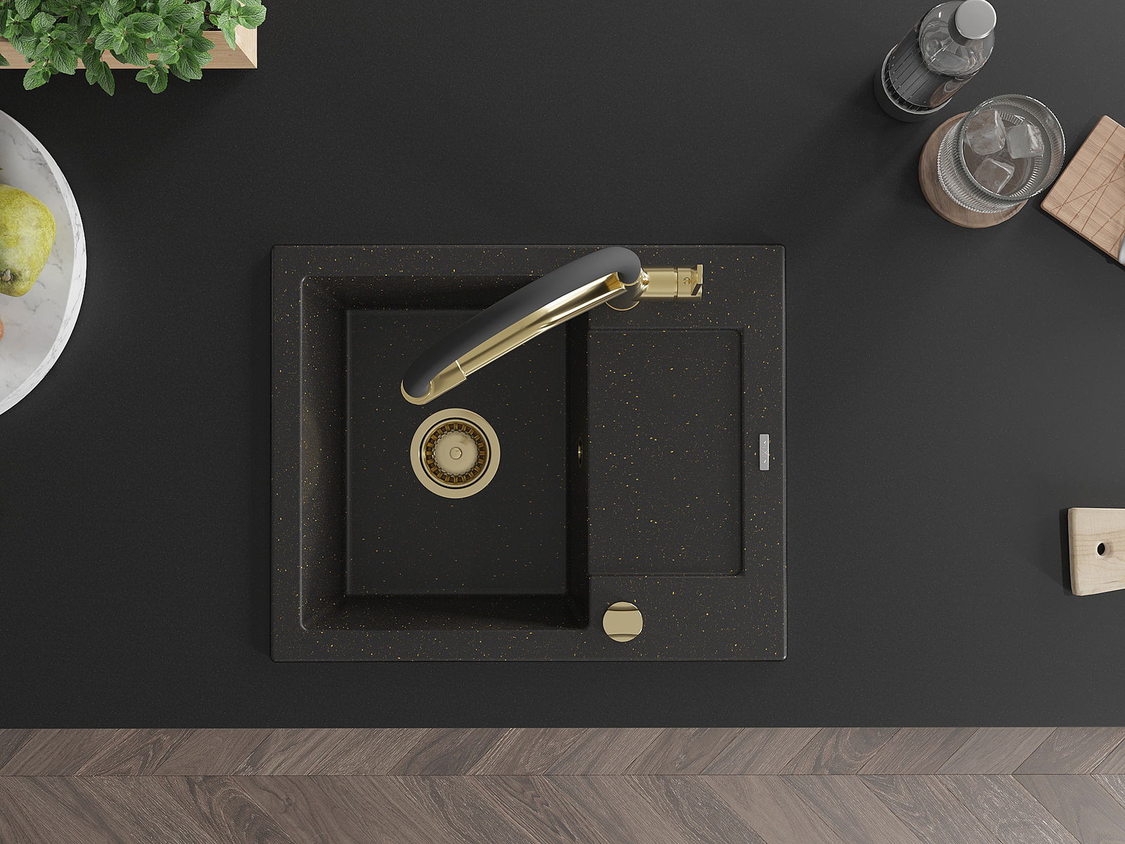 Mexen Enzo zlewozmywak granitowy 1-komorowy z ociekaczem i baterią kuchenną Duo, czarny/złoty metalik - 6506-75-671701-57-G