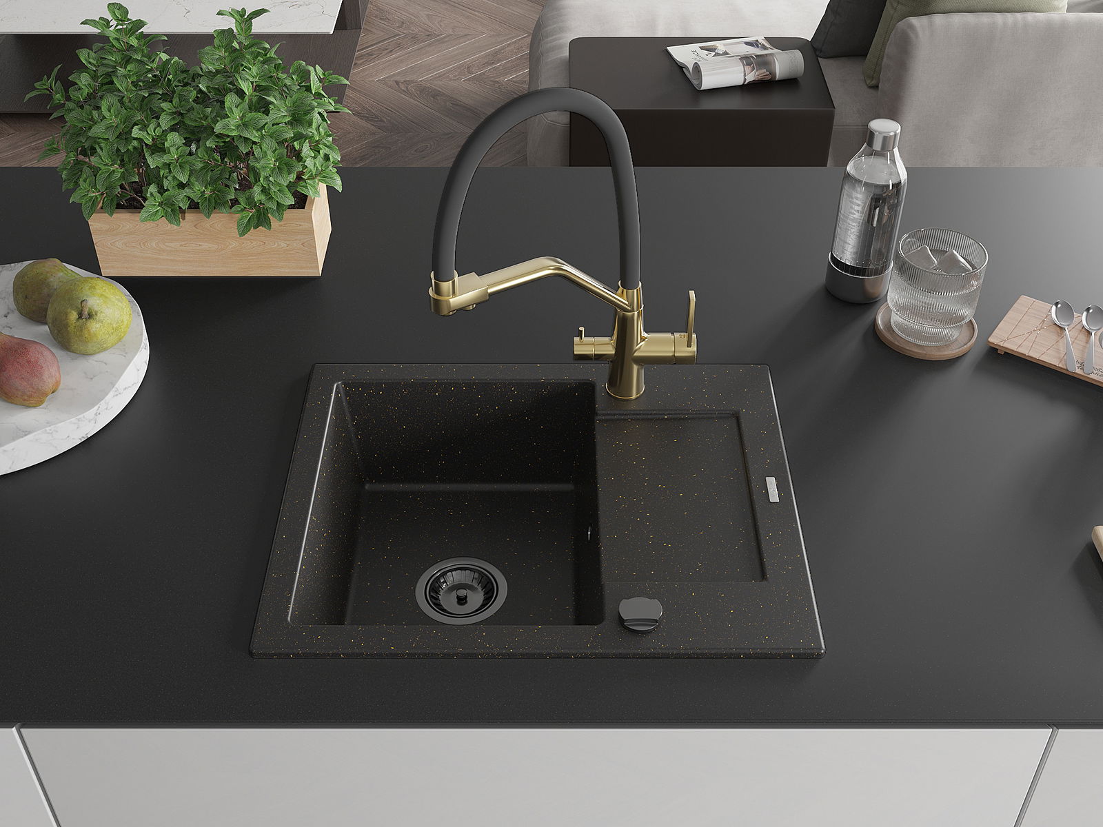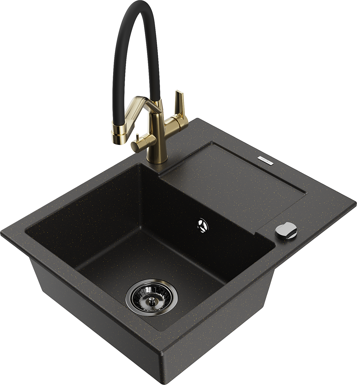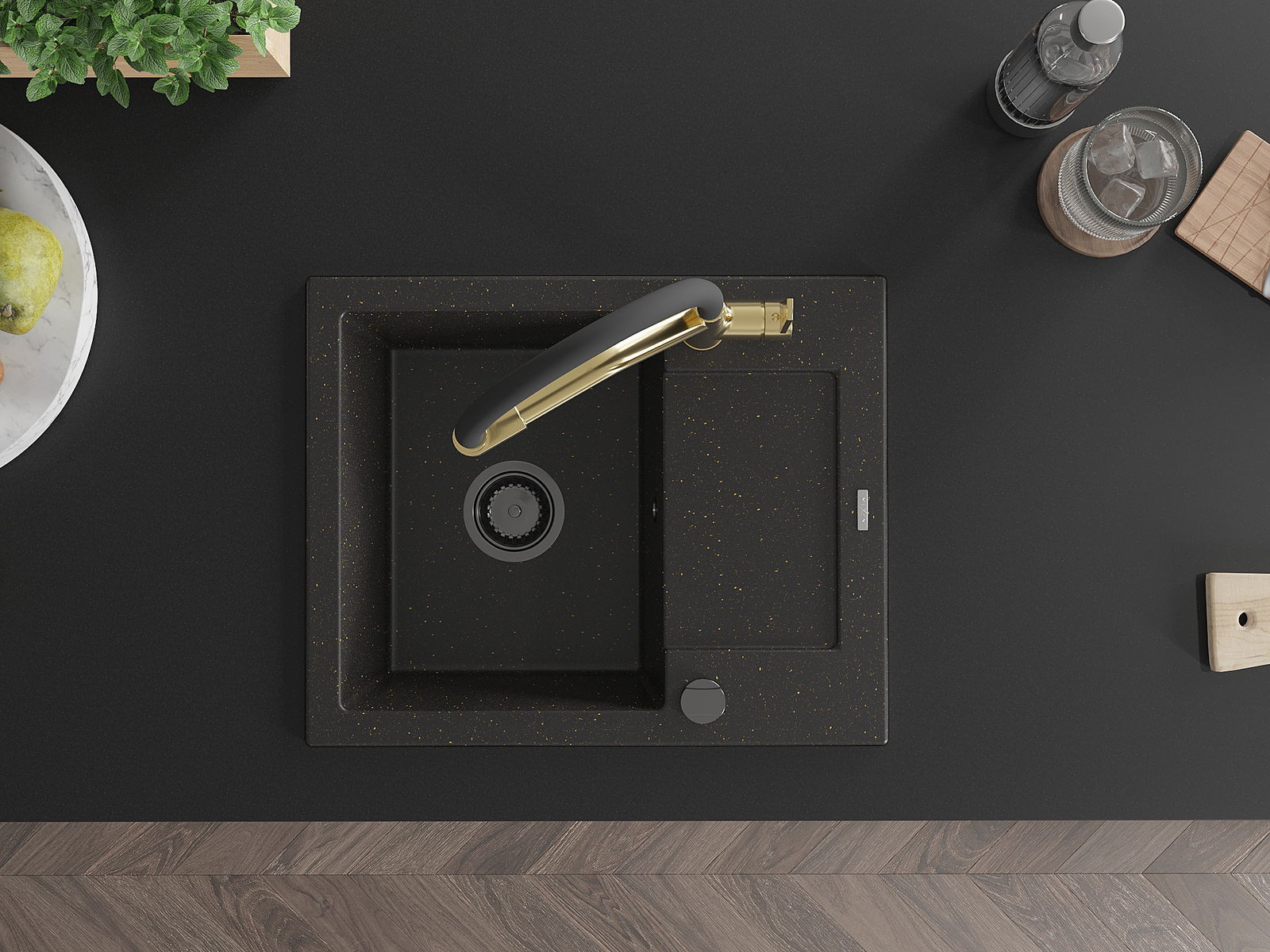 Mexen Enzo zlewozmywak granitowy 1-komorowy z ociekaczem i baterią kuchenną Duo, czarny/złoty metalik - 6506-75-671701-57-B