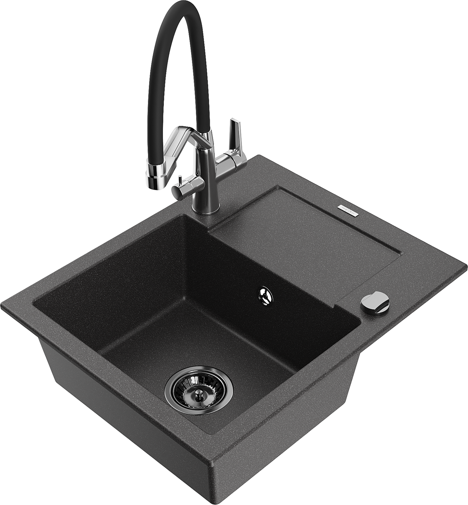 Mexen Enzo zlewozmywak granitowy 1-komorowy z ociekaczem i baterią kuchenną Duo, czarny nakrapiany - 6506-76-671701-07-B