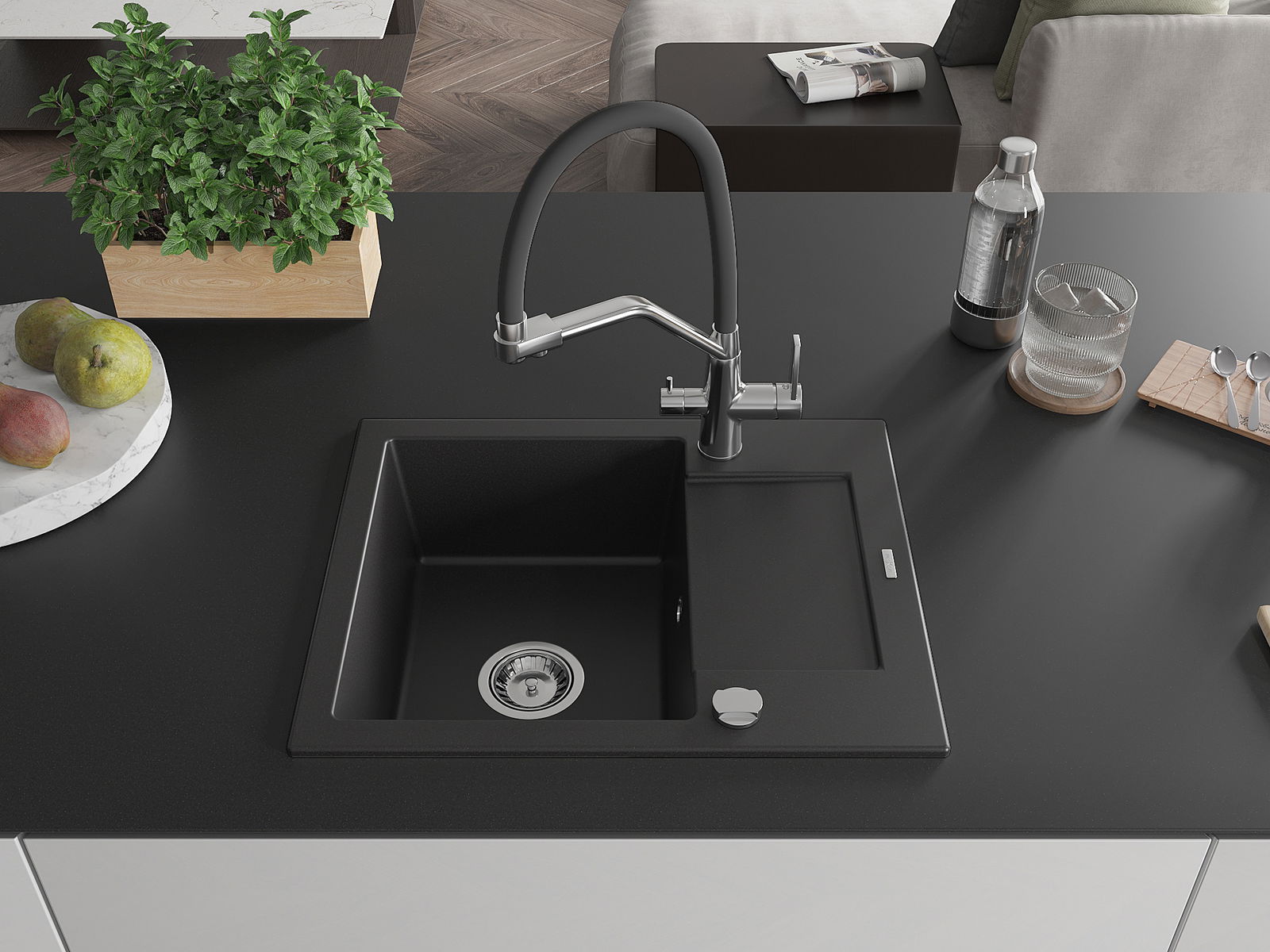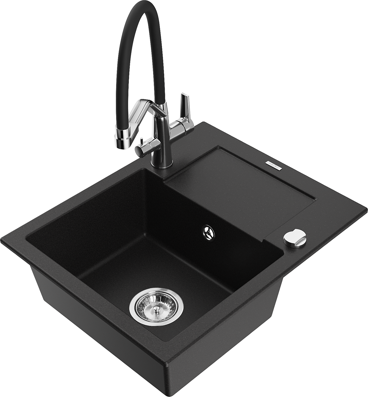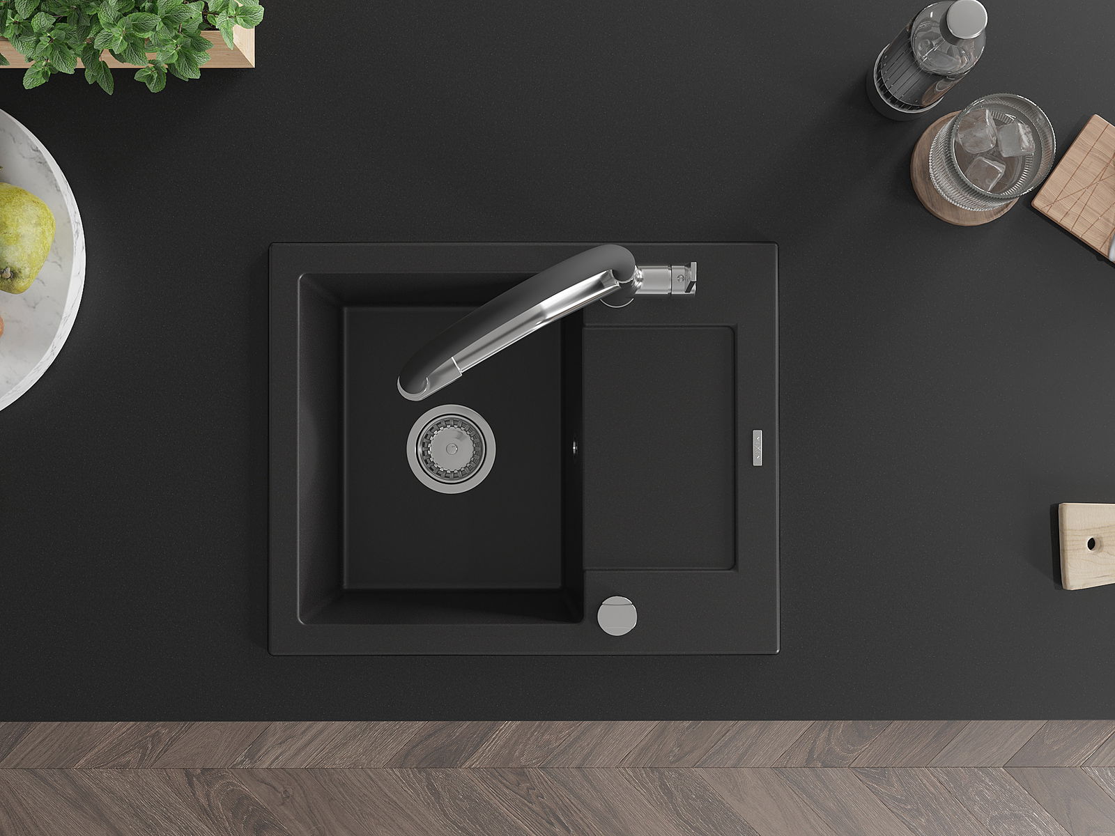 Mexen Enzo zlewozmywak granitowy 1-komorowy z ociekaczem i baterią kuchenną Duo, czarny - 6506-77-671701-07