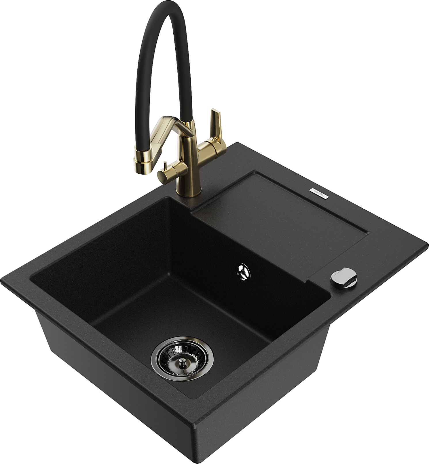 Mexen Enzo zlewozmywak granitowy 1-komorowy z ociekaczem i baterią kuchenną Duo, czarny - 6506-77-671701-57-B