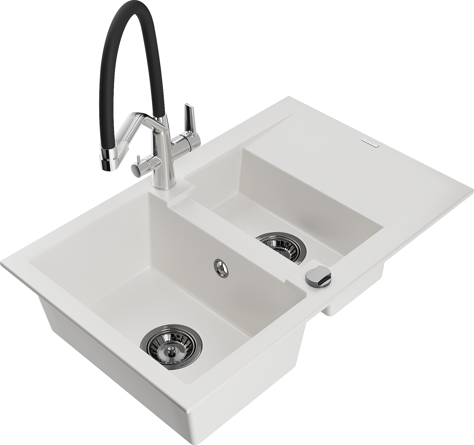 Mexen Gaspar zlewozmywak granitowy 1,5-komorowy z ociekaczem i baterią kuchenną Duo, biały - 6507-20-671701-07-B