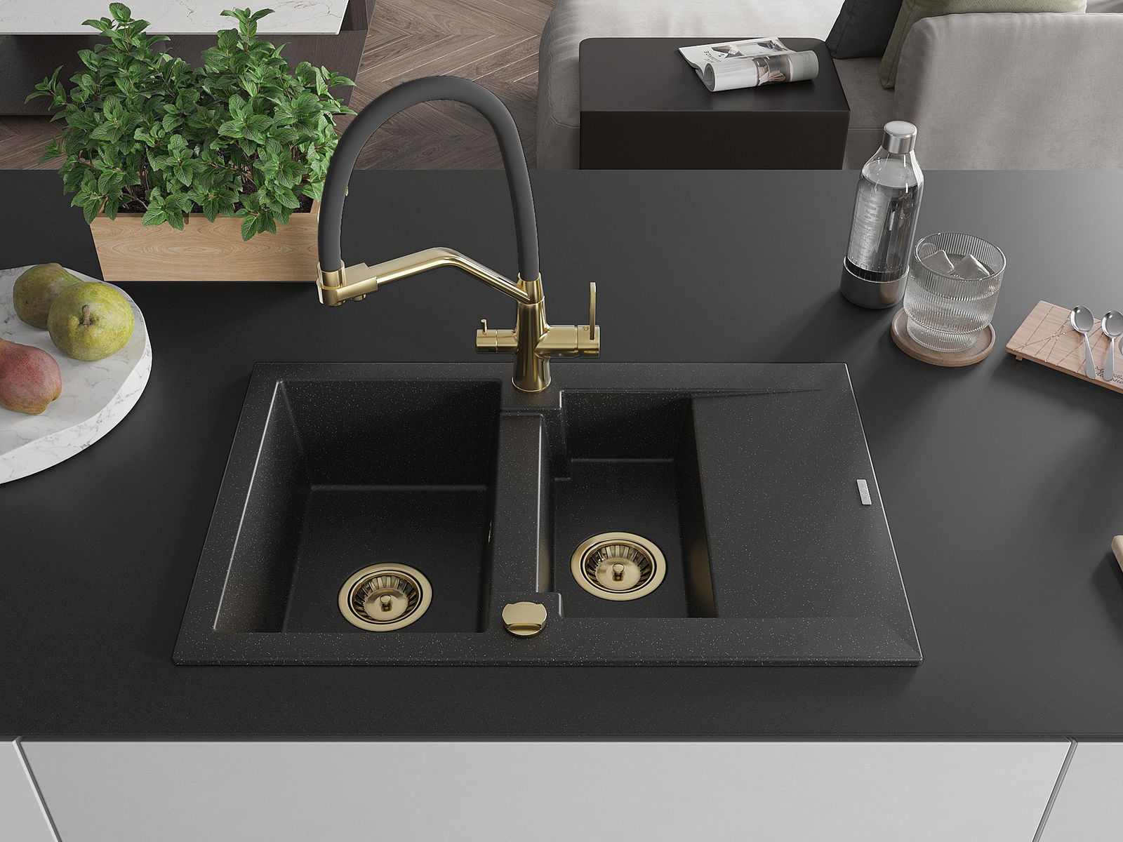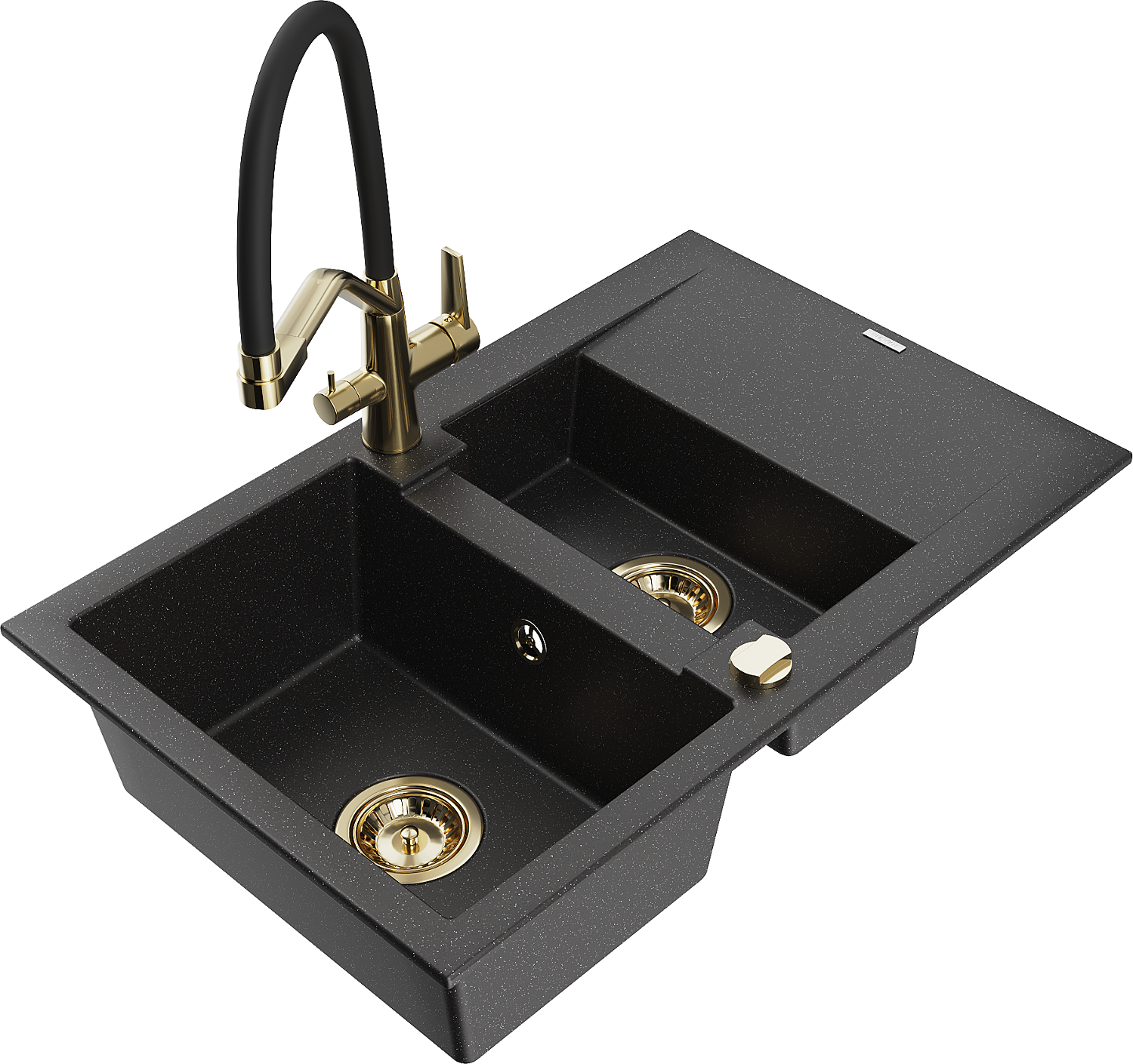 Mexen Gaspar zlewozmywak granitowy 1,5-komorowy z ociekaczem i baterią kuchenną Duo, czarny/srebrny - 6507-73-671701-57-G