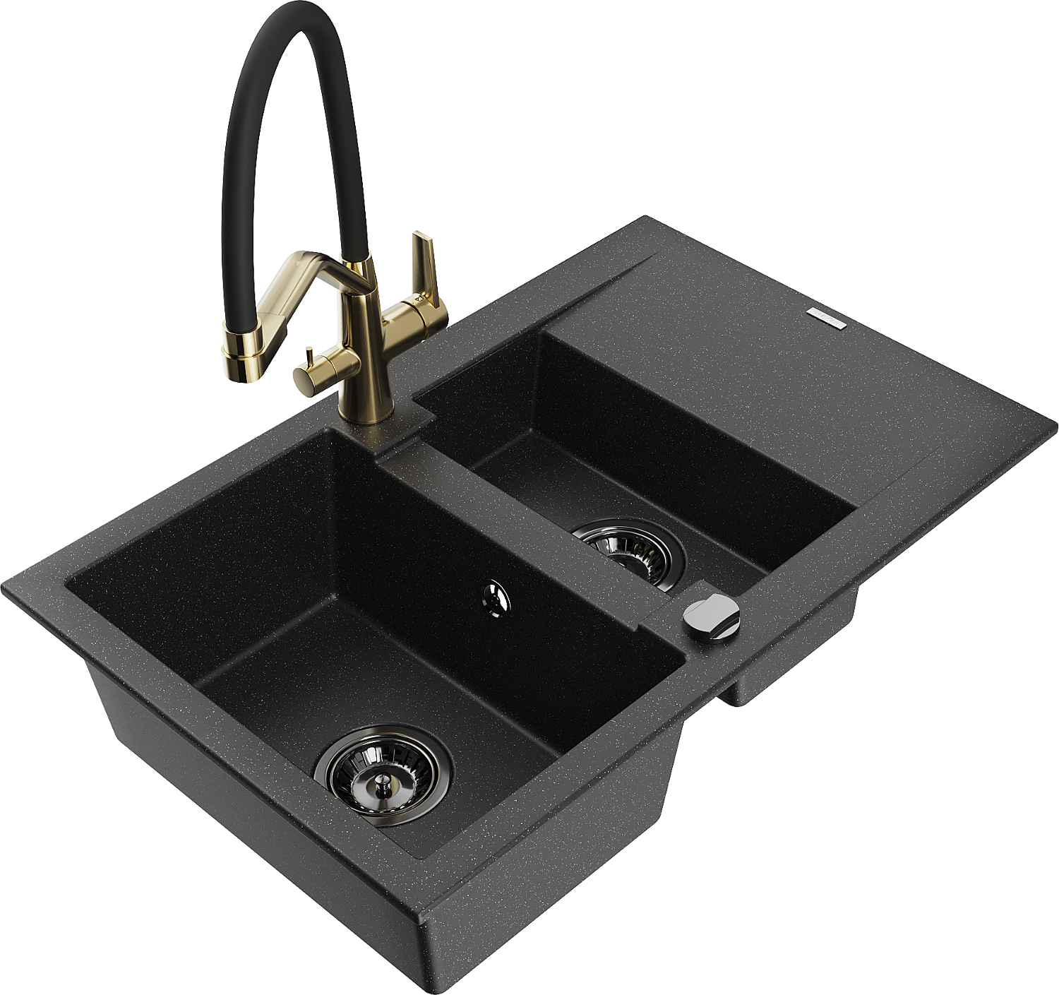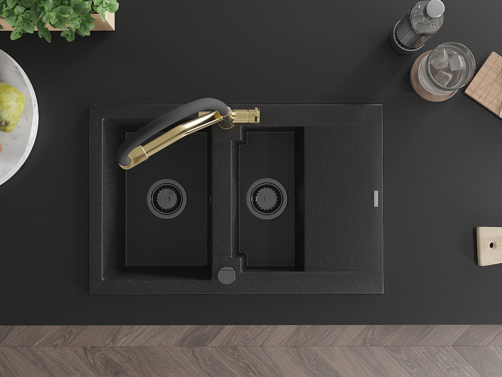 Mexen Gaspar zlewozmywak granitowy 1,5-komorowy z ociekaczem i baterią kuchenną Duo, czarny/srebrny - 6507-73-671701-57-B