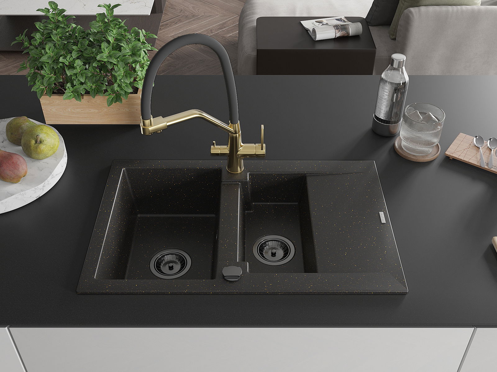 Mexen Gaspar zlewozmywak granitowy 1,5-komorowy z ociekaczem i baterią kuchenną Duo, czarny/złoty metalik - 6507-75-671701-57-B