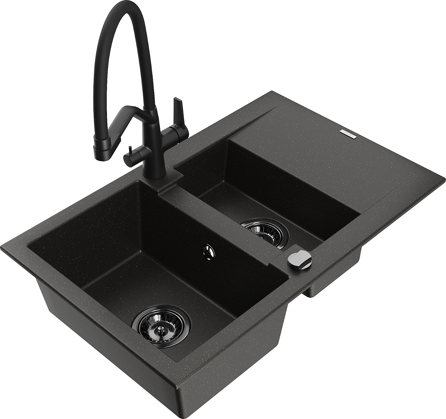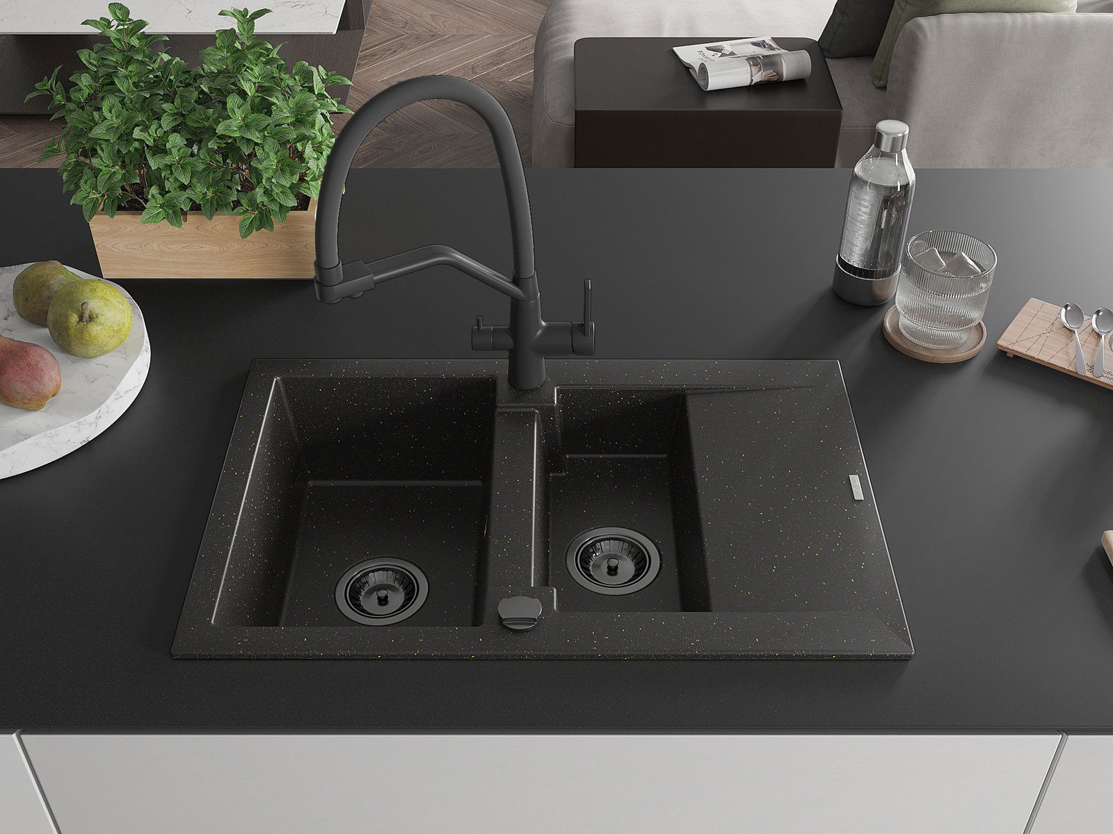 Mexen Gaspar zlewozmywak granitowy 1,5-komorowy z ociekaczem i baterią kuchenną Duo, czarny/złoty metalik - 6507-75-671701-70-B