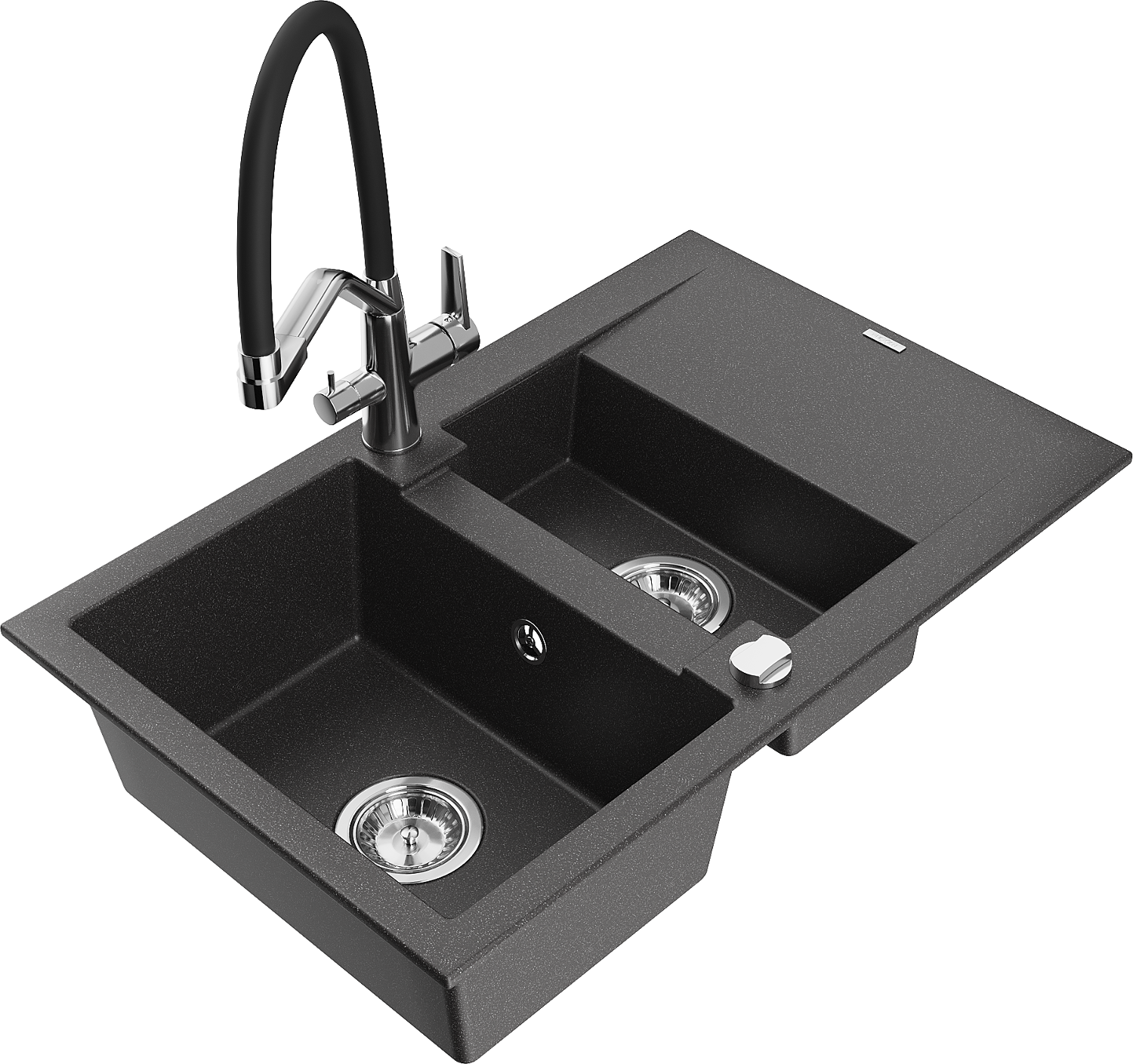Mexen Gaspar zlewozmywak granitowy 1,5-komorowy z ociekaczem i baterią kuchenną Duo, czarny nakrapiany - 6507-76-671701-07