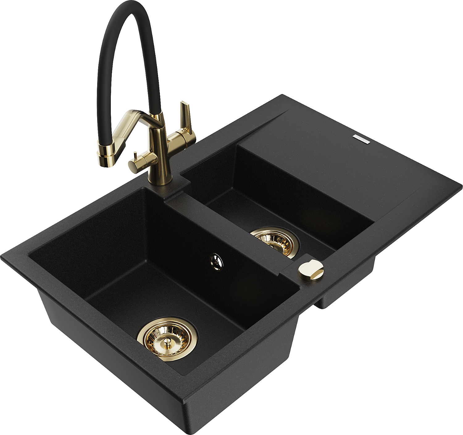 Mexen Gaspar zlewozmywak granitowy 1,5-komorowy z ociekaczem i baterią kuchenną Duo, czarny - 6507-77-671701-57-G