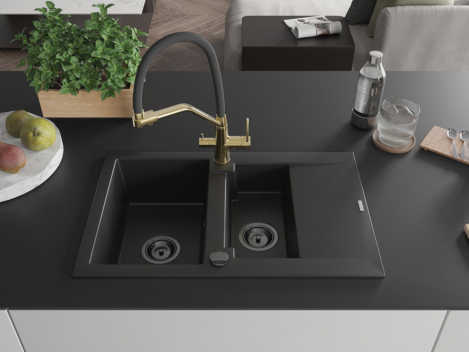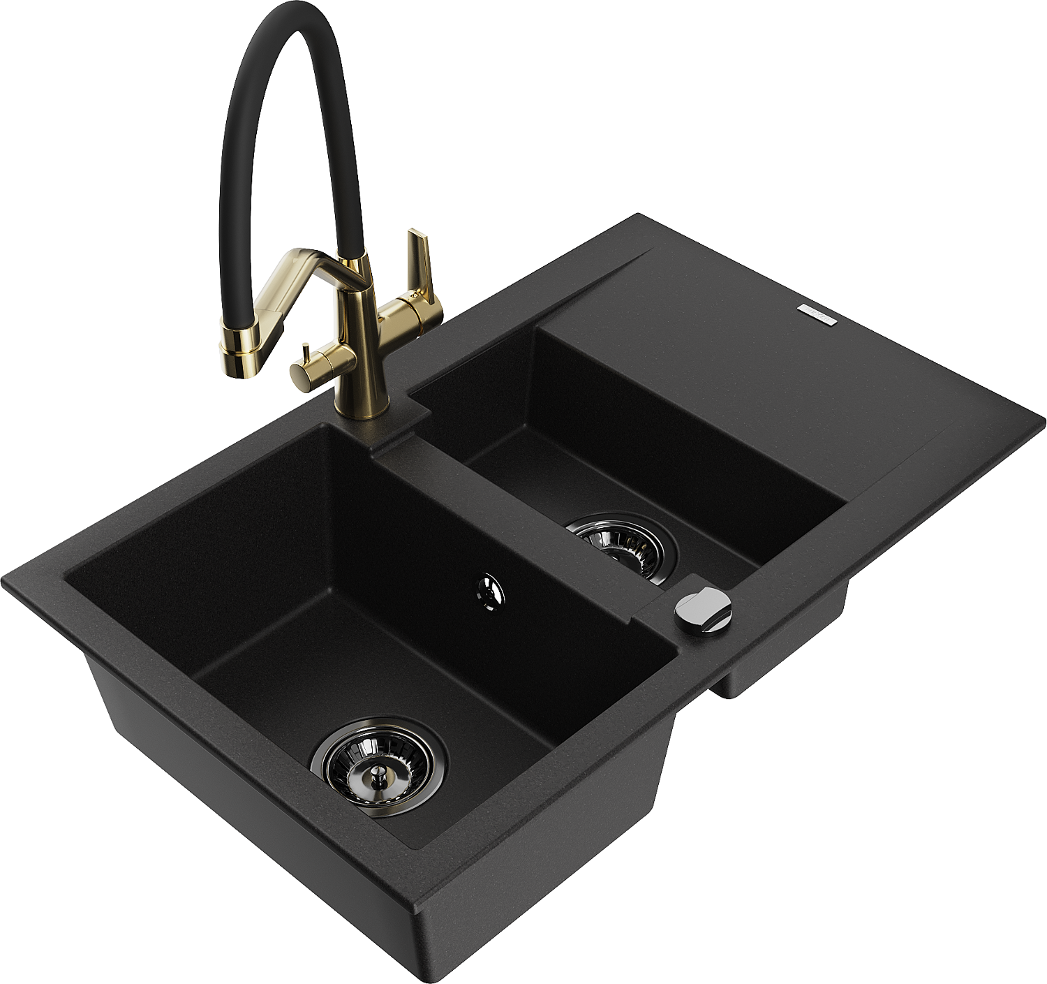 Mexen Gaspar zlewozmywak granitowy 1,5-komorowy z ociekaczem i baterią kuchenną Duo, czarny - 6507-77-671701-57-B