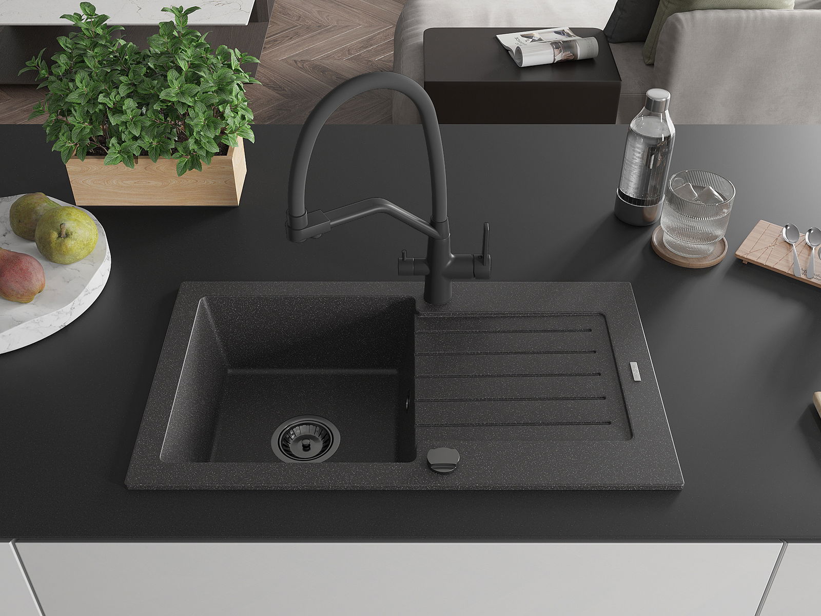 Zlewozmywak został wykonany z wysokiej jakości granitu. Stanowi eleganckie, a przede wszystkim praktyczne uzupełnienie każdej kuchni, niezależnie od jej stylu. Wysoka jakość oraz trwałość granitu zapewniają wieloletnie użytkowanie.